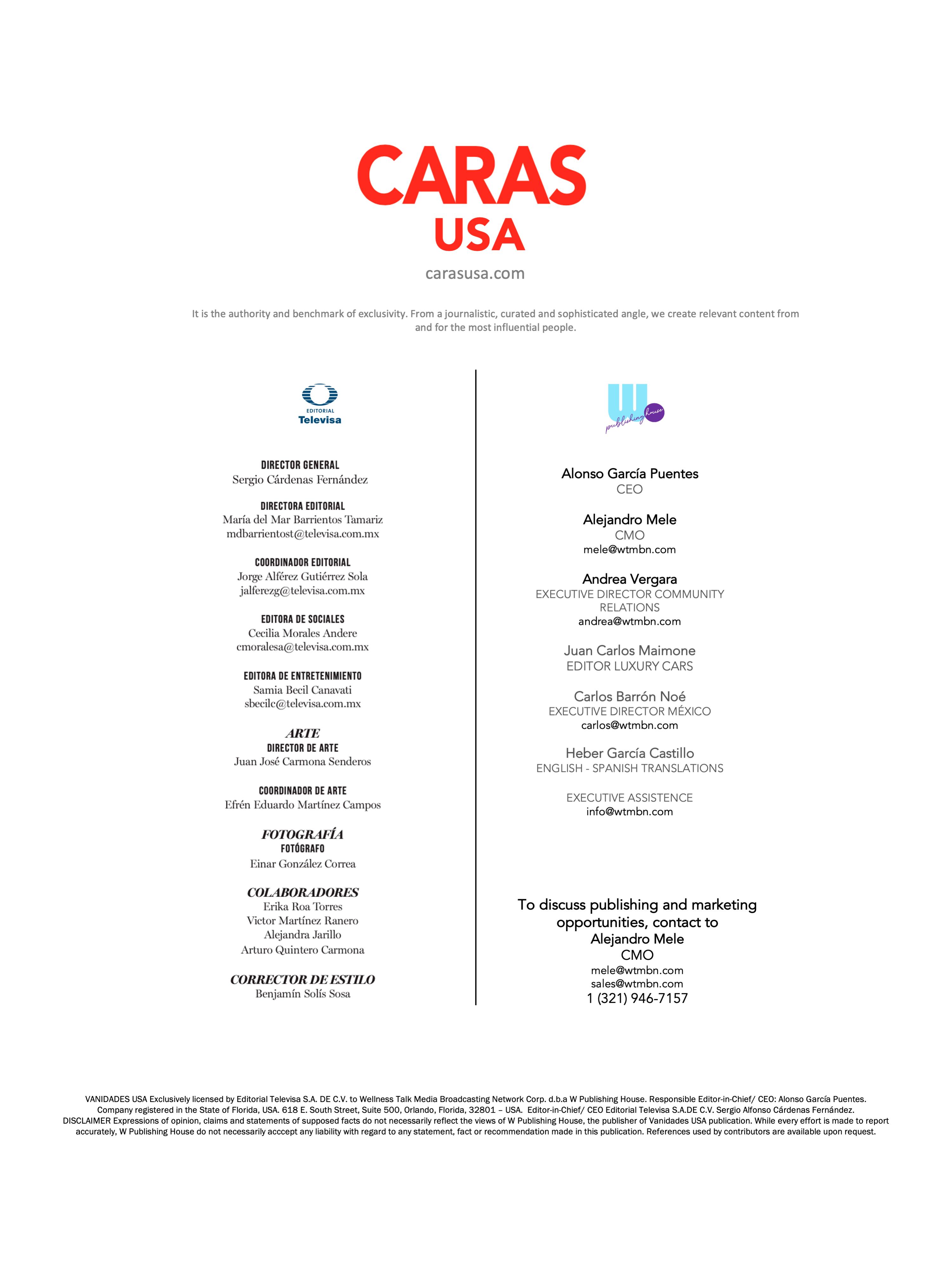 To discuss publishing and marketing opportunities, contact to Alejandro Mele mele@wtmbn.com 1 (321) 946-7157 CARAS © CARAS. Marca Registrada. Año 22 N° 06. Fecha de publicación: 31-05-23 Revista mensual, editada y publicada por EDITORIALTELEVISA, S.A. DE C.V., con domicilio en Avenida Vasco de Quiroga N° 2000, Edificio E, Colonia Santa Fe, Alcaldía Alvaro Obregón, C.P. 01210, Ciudad de México. Tel.: 52-61-20-00. Editor responsable: Sergio Alfonso Cardenas Fernandez. Derechos al Uso Exclusivo del Título CARAS: 04-2015-051212120100-102 con fecha de vencimiento 12 de mayo de 2023 ante el Instituto Nacional del Derecho de Autor. Certificado de Licitud de Título N° 12285, de fecha 13 de diciembre de 2002; Certificado de Licitud de Contenido N° 8948, de fecha de 13 de diciembre de 2002, ambos con expediente N° 1/432”02”/16083, ante la Comisión Calificadora de Publicaciones y Revistas Ilustradas. Distribuidora Intermex S.A. de C.V., con domicilio en Calle Lucio Blanco N° 435, Colonia San Juan Tlihuaca, Alcaldía Azcapotzalco, C.P. 02400, Ciudad de México. Tel.: 52-30-95-00. Distribución en zona metropolitana: Unión de Expendedores yVoceadores de los Periódicos de México, A.C., con domicilio en Calle Guerrero N° 50, Colonia Guerrero, Alcaldía Cuauhtemoc, C.P. 06350. Tel.: 55-91-14-00. Impresa por: Servicios profesionales de Impresión S.A. de C.V. Mimosas 31, Colonia Santa María Insurgentes, CDMX, C.P. 06430 TEL . 51170100. EDITORIALTELEVISA S.A. DE C.V. investiga sobre la seriedad de sus anunciantes, pero no se responsabiliza con las ofertas relacionadas por los mismos. ATENCIÓN A CLIENTES: a toda la Republica Mexicana tel. 01 800 REVISTA (7384782). Las opiniones expresadas por los autores no necesariamente reflejan la postura del editor de la publicación. Queda estrictamente prohibida la reproducción total o parcial del contenido e imágenes de la publicación sin previa autorización de Editorial Televisa, S.A. de C.V. IMPRESA EN MEXICO - PRINTED IN MEXICO. D.R. © Editorial Televisa, S.A. de C.V., Avenida Vasco de Quiroga No. 2000, Col Santa Fe, C.P. 01210, Ciudad de México