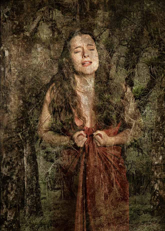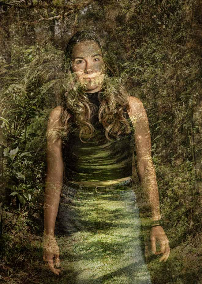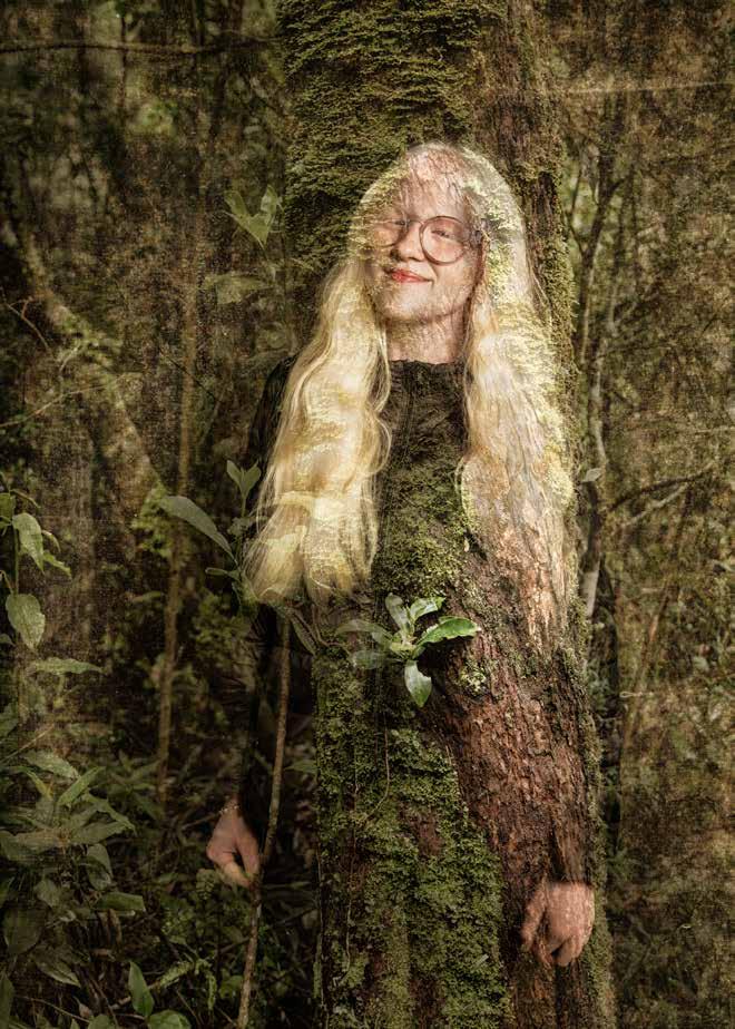 At this point in the story, I must tell my subjects in this project that I have no intention of disappearing from these mountains. On the contrary, I came here to one day also become a tree. What I realized is that, looking around, I saw people and trees. The people, I brought them into the studio, of course—but the trees, they led me into the forests of the Mantiqueira mountains. In the studio, I was exposed to the aura of these people, much to the astonishment of my Labrador, Laika, who closely followed the portraits, perhaps fearing I might also vanish in the end, like in the story. I think she was the first to sense the phenomenon of the aura or the invisible light of those being photographed. They say dogs hear and see things beyond human perception. Facing away from the models, Laika looked at me, at my camera, and through the studio’s glass doors framing the distant landscape. She seemed to have discovered something that intrigued her canine instincts. Something was happening: I believe it was the trees far away, waving to us, asking to be photographed too.