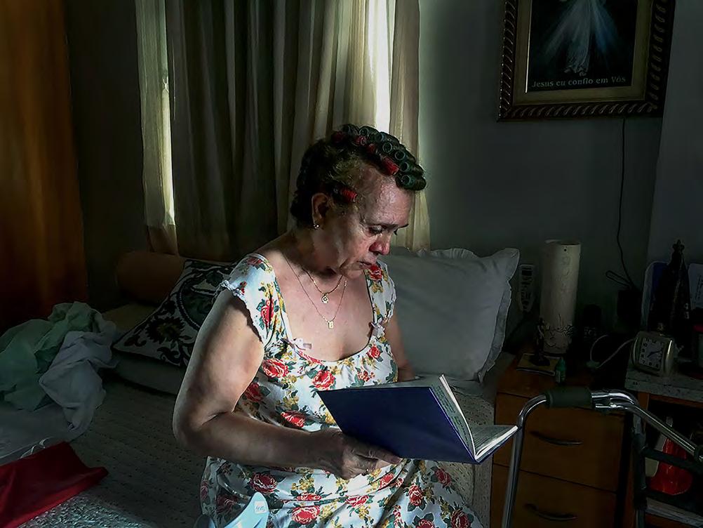 R etratos e paisagens são os mais tradicionais e difíceis registros fotográficos. Estão em todas as fases da história da fotografia. Por isso mesmo, a dificuldade de transformálos em arte fotográfica. Atualmente, os telefones celulares se encarregam de multiplicar e banalizar retratos e paisagens. Biografias fotográficas são feitas utilizando-se apenas retratos, desde o nascimento até a morte. Marcela Elias escolheu o caminho mais difícil: registrar o presente de Dona Elisa e deixar que nós, espectadores, imaginemos sua trajetória. Não fez um romance, produziu uma crônica. Uma crônica com tal intensidade que por vezes nos deixa sem ar. Temos diante de nós, uma personagem de 96 anos que vislumbrava o futuro. Sua geografia epidérmica pede nossa leitura. Seu rosto nos inquire. Há que lembrar os versos citados por Fernando Pessoa: “Navegar é preciso, viver não é preciso”. Esta crônica de Marcella Elias nos mostra que d. Elisa chegou com precisão ao fim da vida.