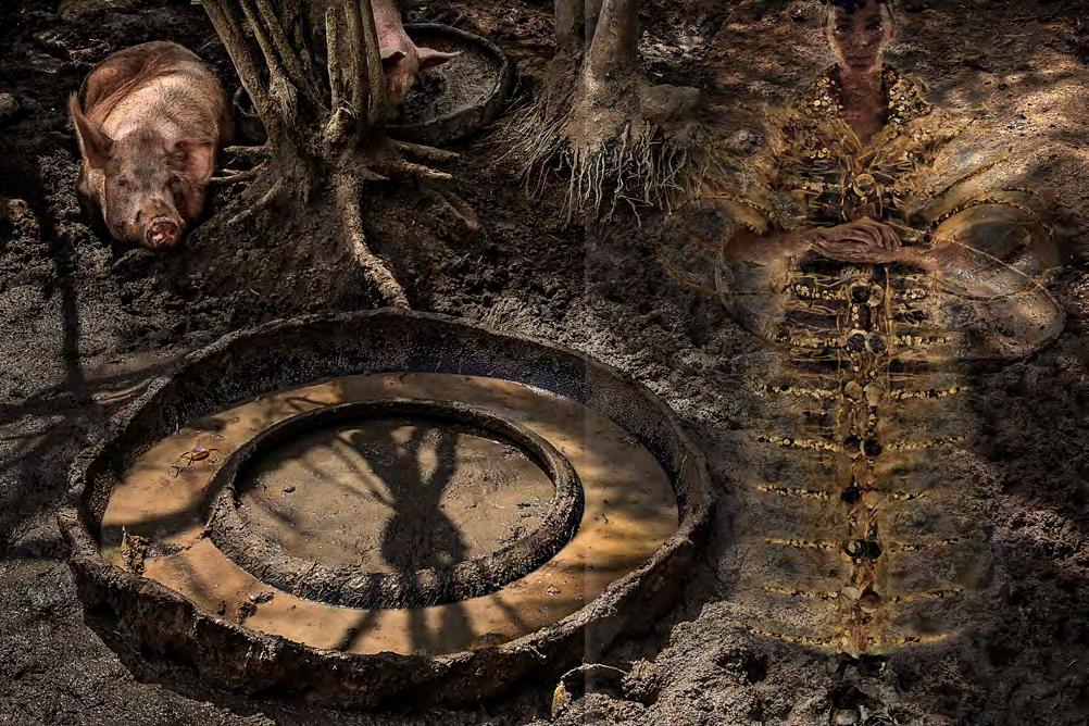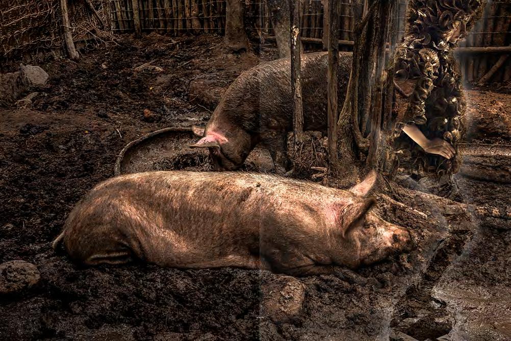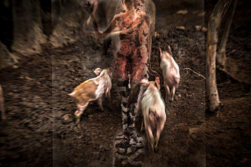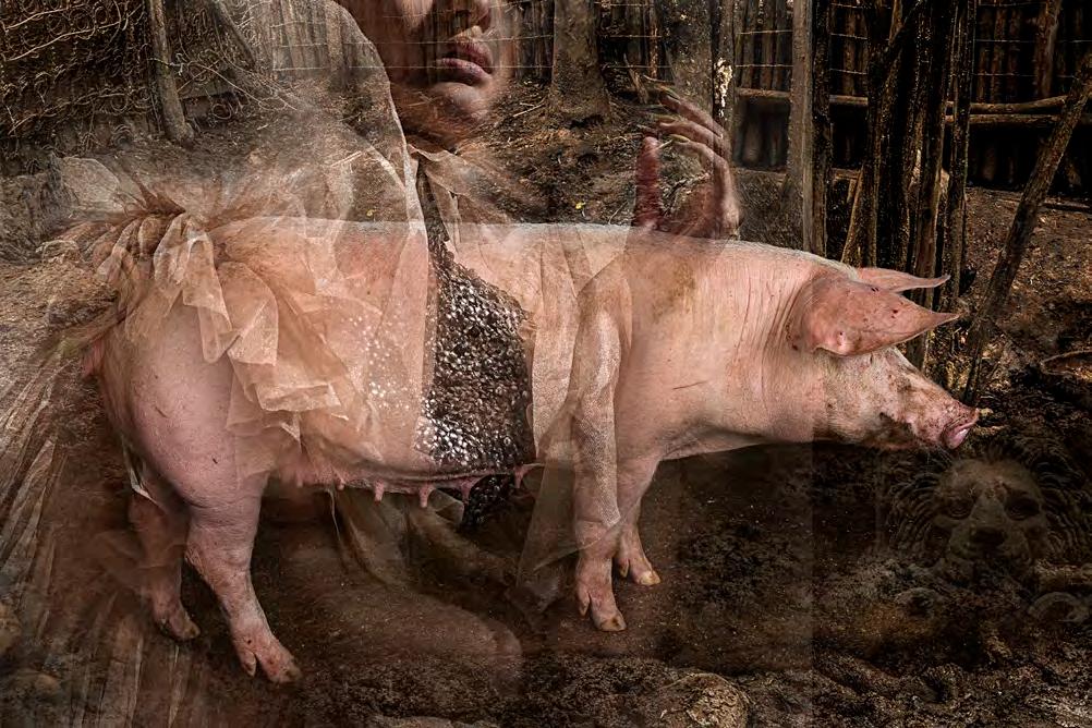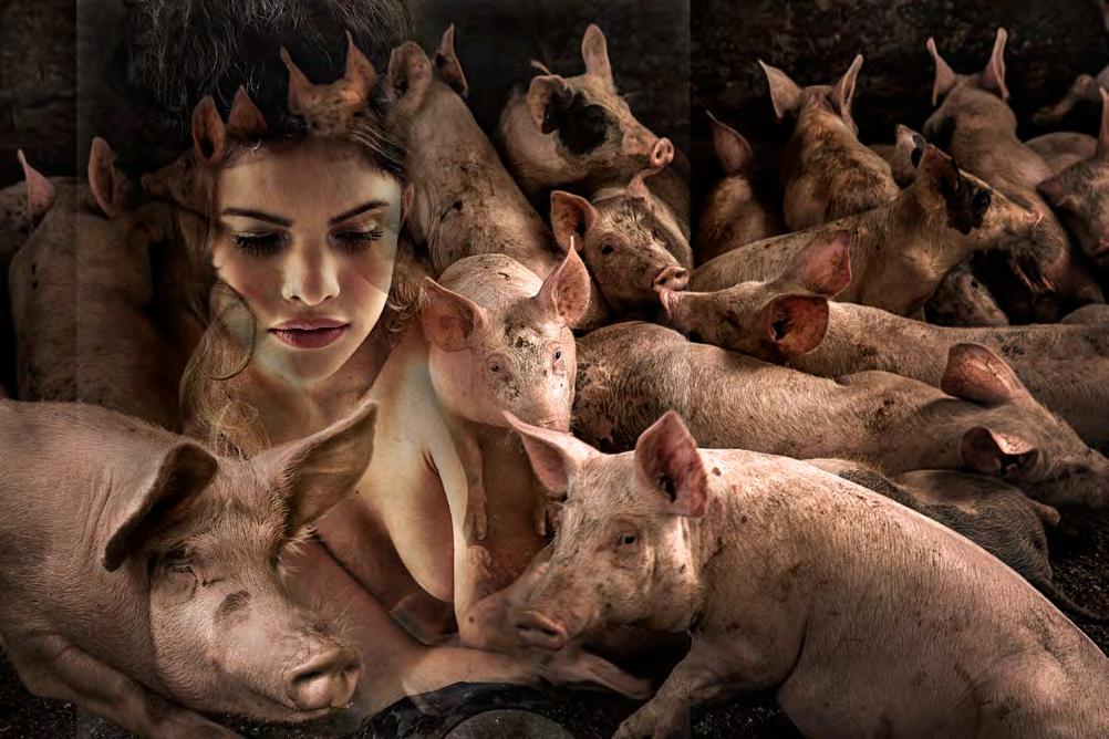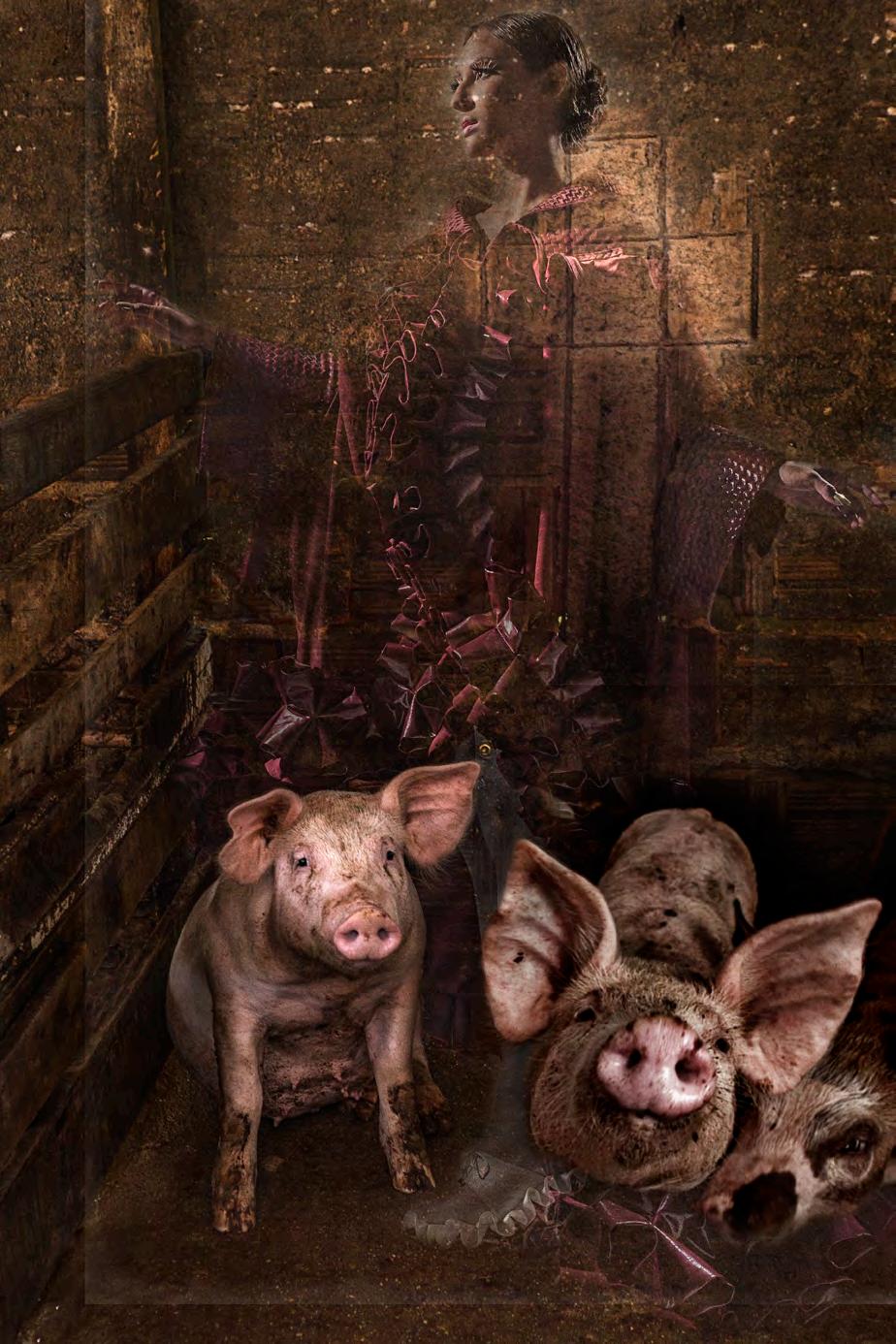 D epois, já no estúdio, essa subversão se concretizou durante a editoração dos arquivos, quando as imagens dos porcos começaram a ganhar a presença de ninfas emprestadas de minhas campanhas publicitárias que, aos poucos, foram se misturando e se entrelaçando em camadas digitais,