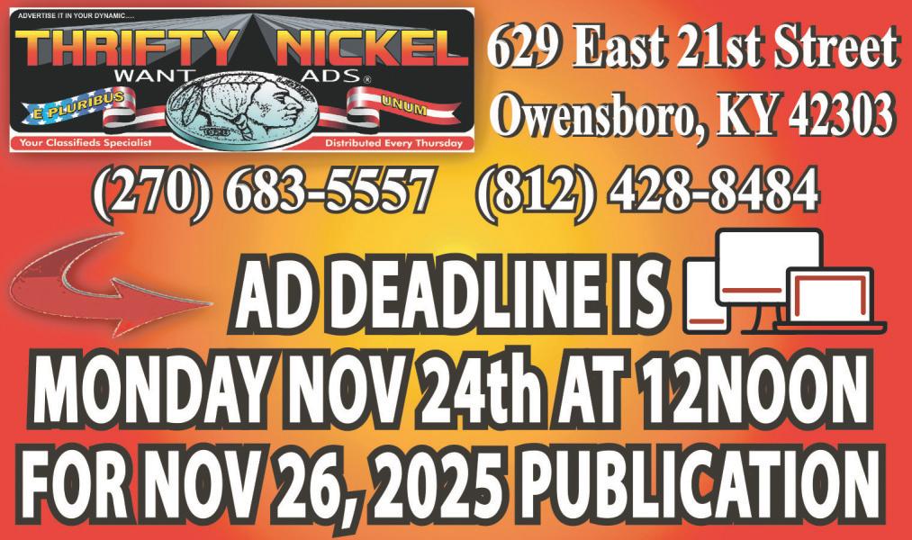 Only in your Thrifty Nickel can you place a classified ad for only $20 for 4 weeks & reach 1000’s of people. Call & place your ad today & get results you want! 270-683-5557 or 812-4288484.