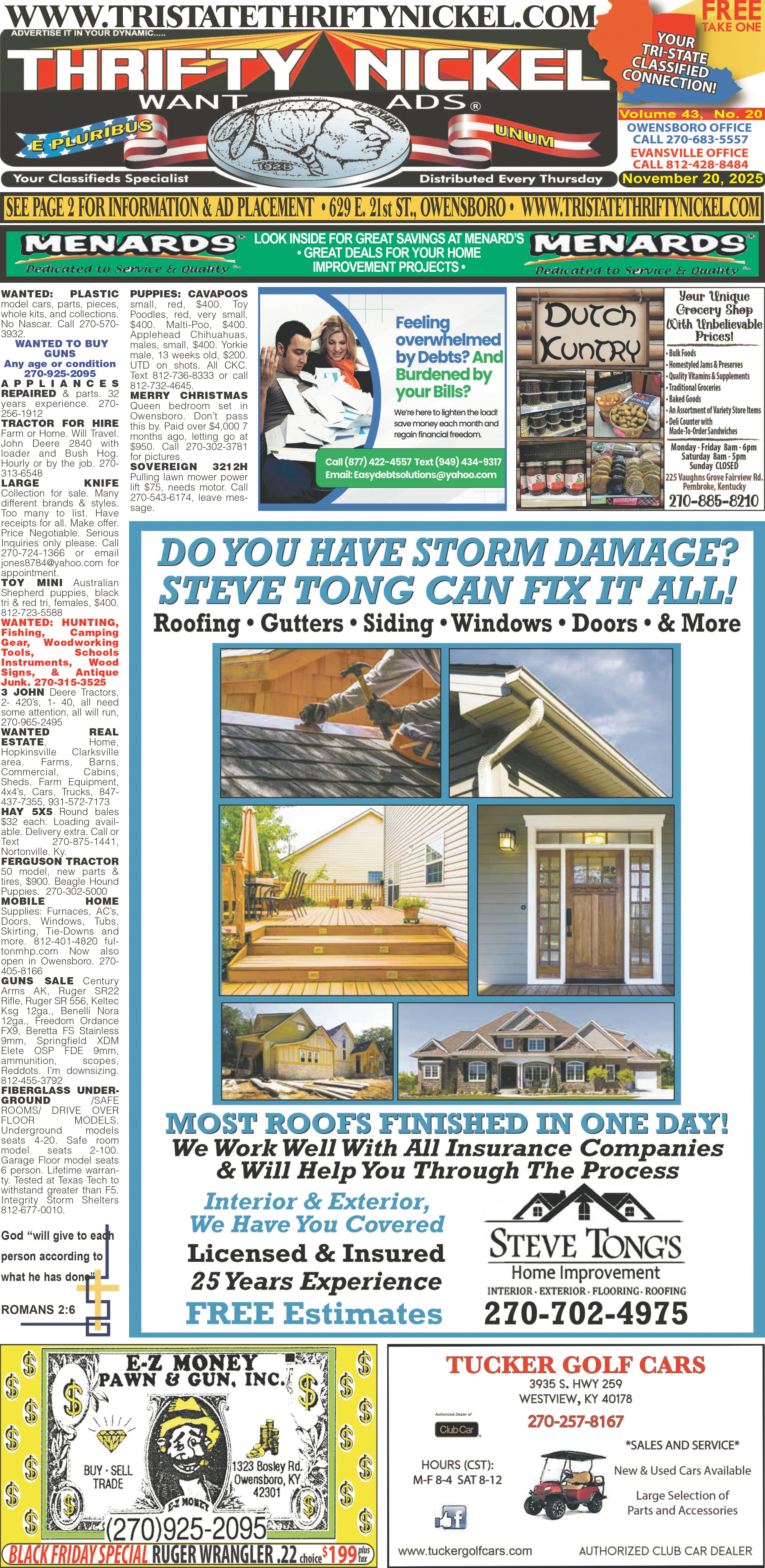 YOU CAN’T FIND a better advertising tool than at your Thrifty Nickel. Place a 15 word classified ad for only $20 for 4 weeks. Call today, 270-683-5557 or 812-428-8484. BUYING “SILVER” E-Z Money Pawn, 270-925-2095