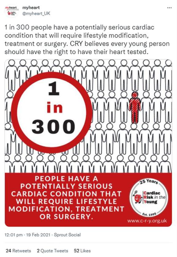 have their heart checked and last year we tested almost 30,000 young people. 1 in 300 people we test will have a potentially life-threatening condition identified and research we published last year showed that of those athletes identified with conditions 75% of them returned to competitive sport after being treated.