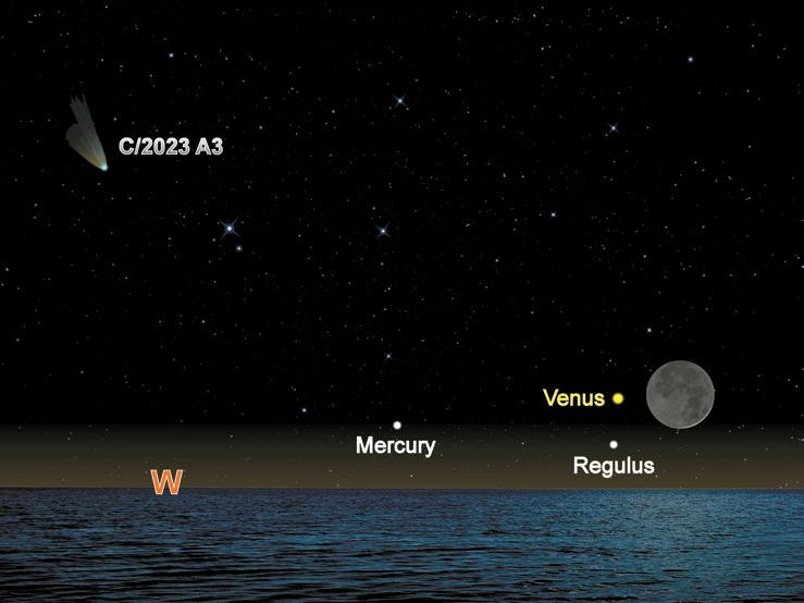Mercury can be seen six degrees left of Venus. Comet C/2023 A3 will be brightening over the next two months. Currently it is in the western sky after sunset. In two weeks it will be lost in the glare of the Sun. Look for it to reappear low in the east before sunrise in the end of September. Comet C/2023 will reach its brightest on October 05.