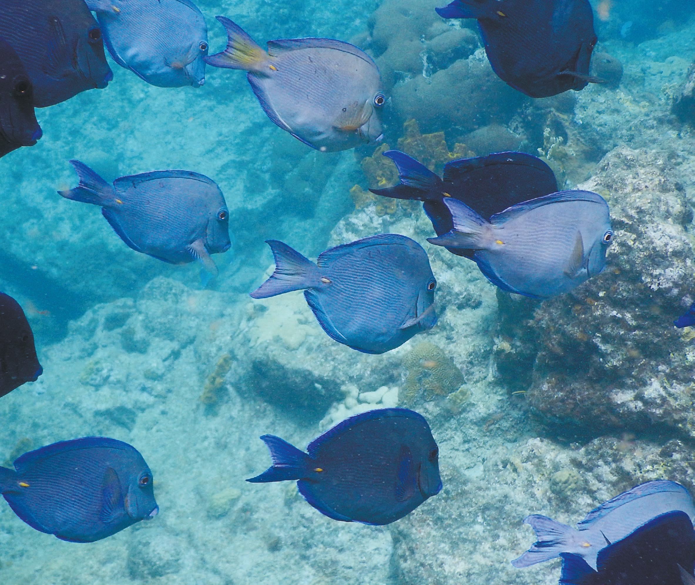 Another common Caribbean resident that relies on color to indicate its readiness to spawn is the beautiful blue tang (Acanthurus coeruleus). These fish often attract attention as they move across the reef foraging together in large groups. At first glance it is easy to confuse them with their close relative the doctorfish (Acanthurus chirurgus). As members of the Acanthuridae or surgeonfish family, both species bear the sharp, scalpel-like spines at the base of their tails. In the case of the Caribbean blue tang the spines are yellow, while those of the doctorfish are edged in blue.