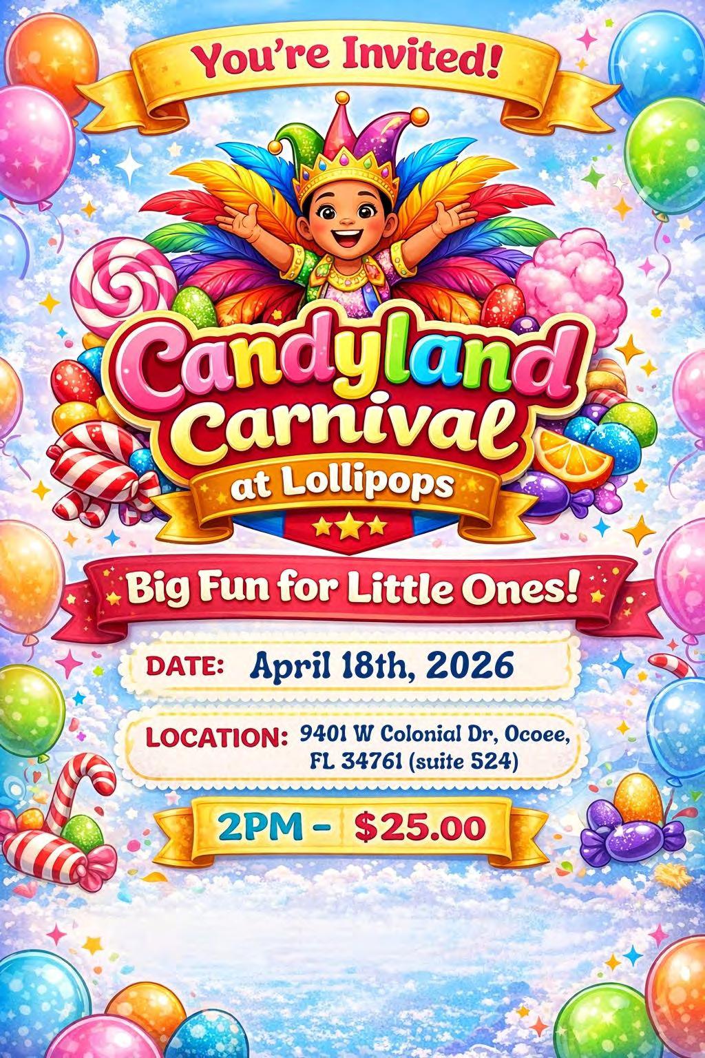 On April 18th, families are invited to experience the Candyland Carnival for Kids at LolliPops Indoor Playground & Party Place, a joyful indoor celebration designed especially for little ones. This magical event transforms LolliPops’ indoor mall space into a colorful carnival world filled with music, movement, and imagination, creating a safe and exciting environment for kids to play and explore.