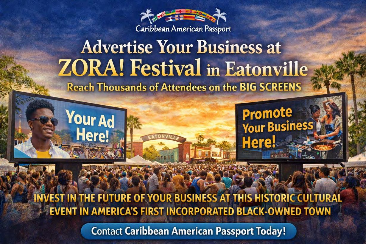 Caribbean American Passport is excited to announce a unique promotionalopportunityforlocalbusinessownersatthisyear’s ZORA! Festival in Eatonville. Through this initiative, businesses will have the chance to advertise directly on the festival’s largedigital screens, placing their brand in front of thousands of attendees throughout the day. With continuous foot traffic and a lively, engaged audience, this platform offers unmatched visibility during one of Central Florida’s mostcelebratedculturalevents.