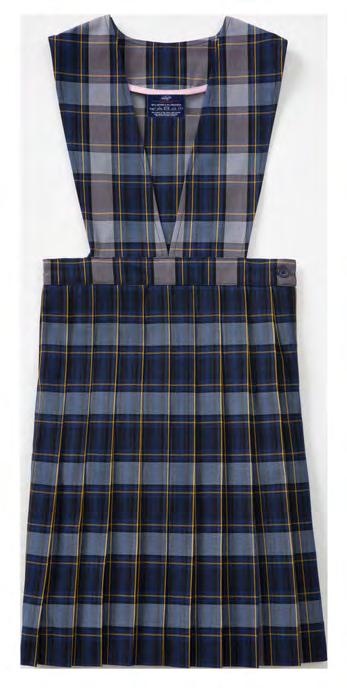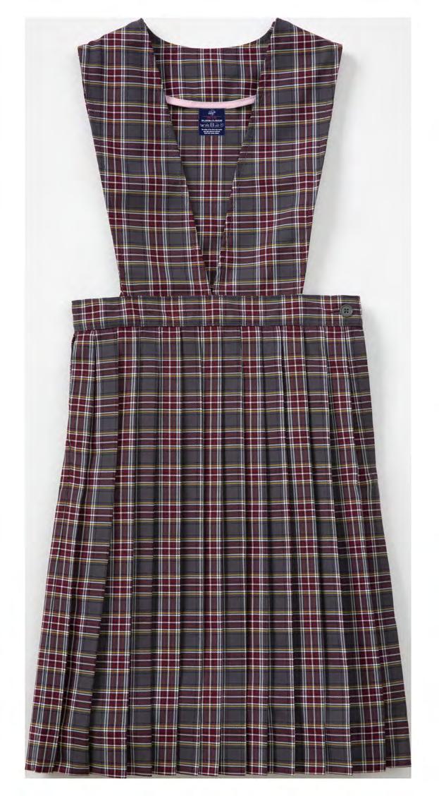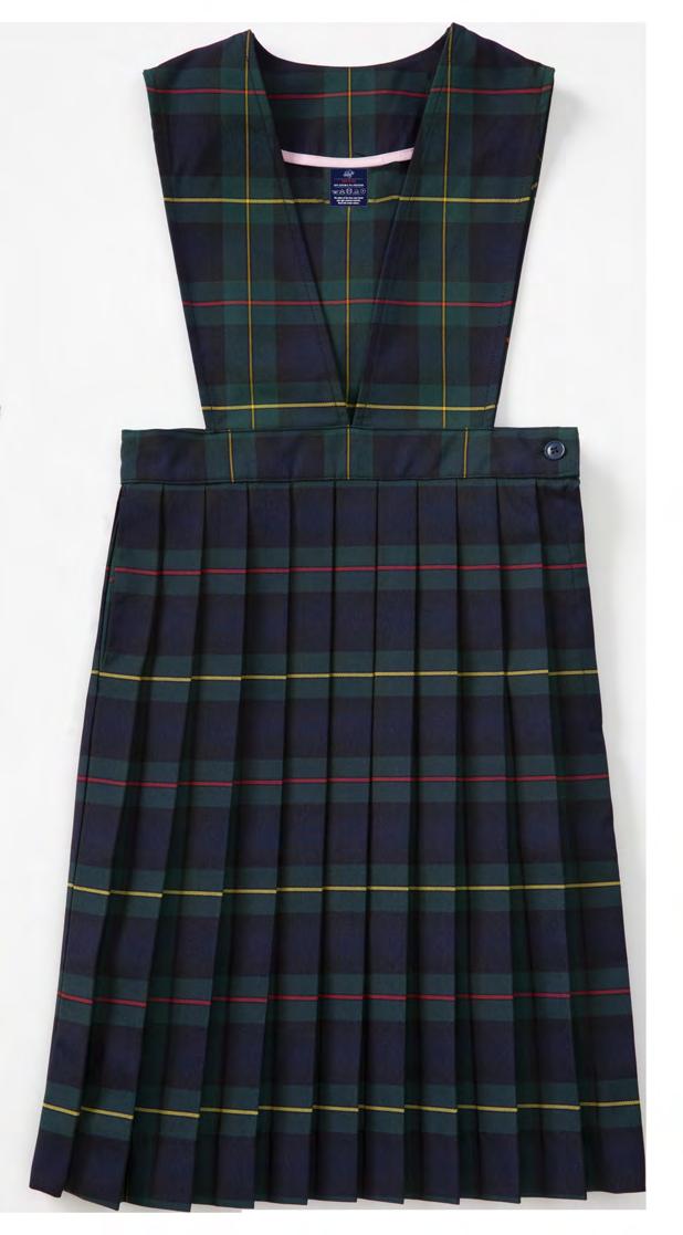 Plaid jumper with front and back pleats, decorative button detail at waistband, two side seam pockets and back zip closure. 100% Polyester.
