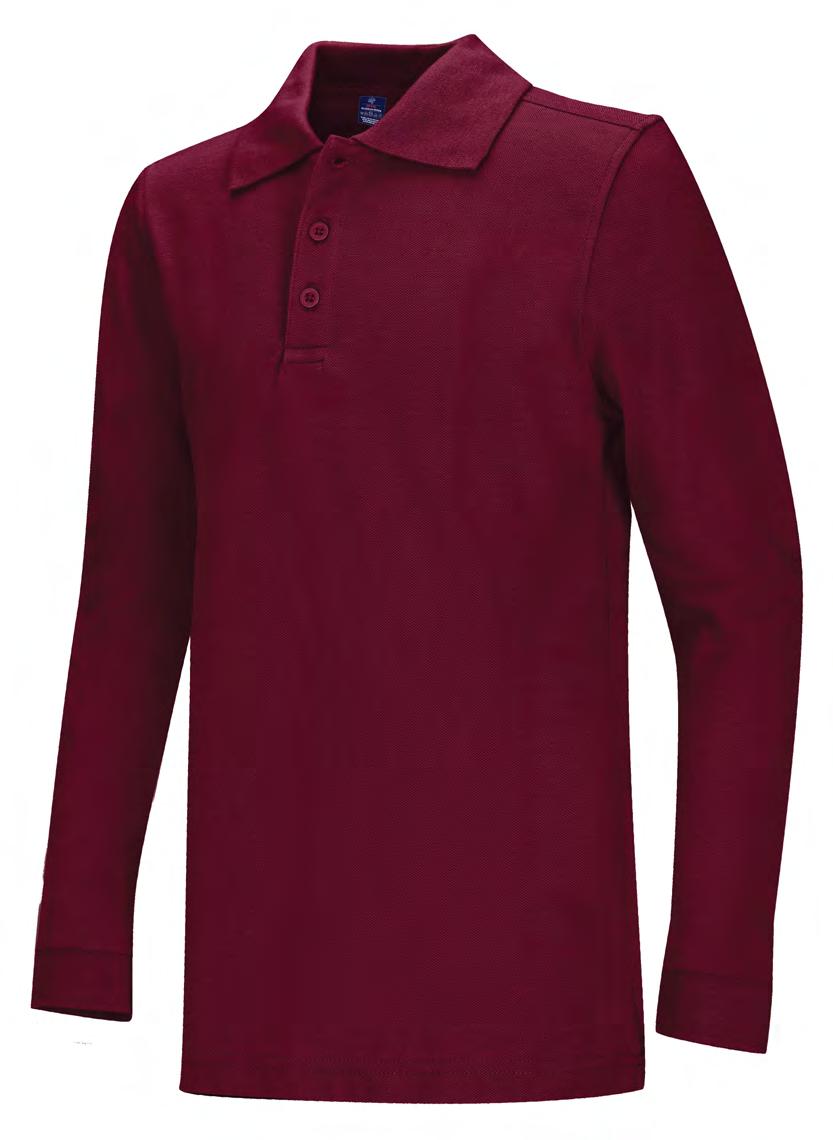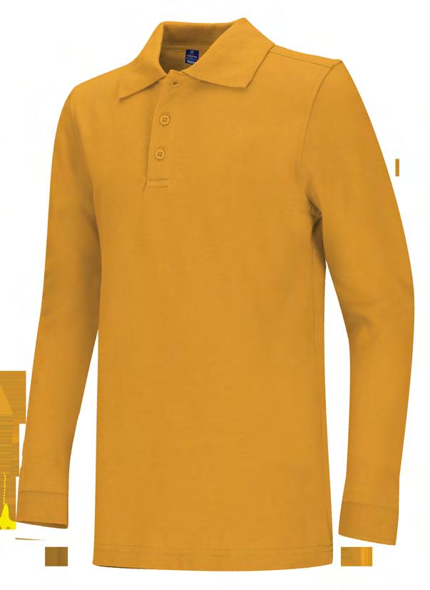 Blend of combed cotton and poly with ringspun yarns. Ribbed collar and cuffs that match, three-button placket with buttons that are dyed to match.
