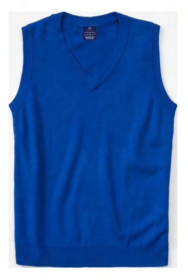 V-neck pullover vest with half Milano stitch and ribbed armholes, neck, and hem that is free of pilling.