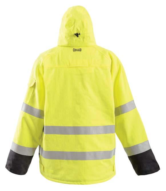 Zip-on and off bottom shell to wear twoways. 6 oz FR Cotton Twill upper shell. 6.5 oz Modacrylic /Cotton Jersey upper lining. 18 oz Modacrylic/Cotton/Spandex soft rib knit with double button neck closure lower. Insulated ear barrier DuPont™ Tyvek® lined warming pockets and metal Nomex® Zipper.