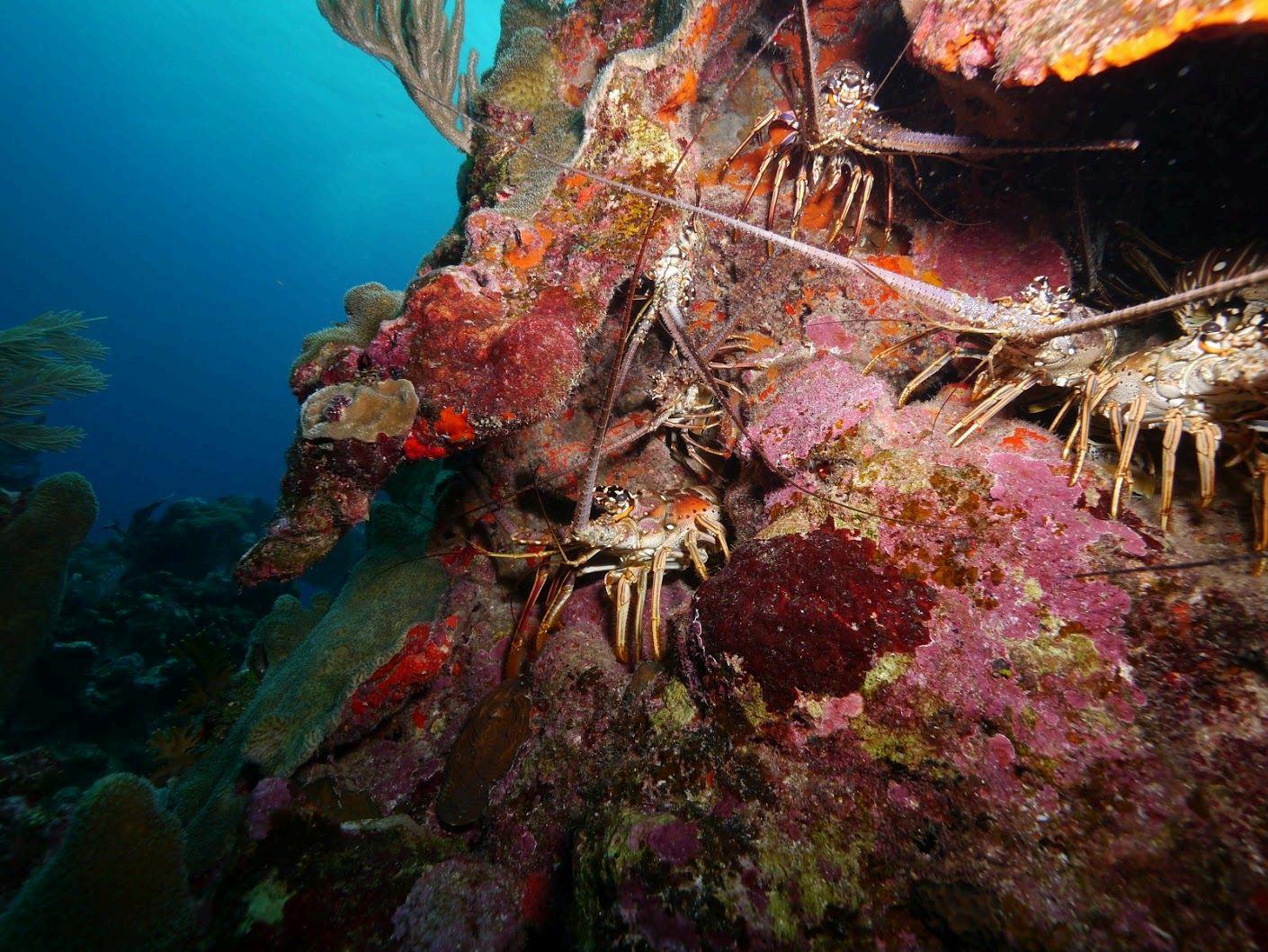 The Caribbean Spiny Lobster is a nocturnal crustacean. They vacate their old shells while simultaneously absorbing water , expanding their body size. At night, they move away from the cravices and holes in coral reefs to feed on a wide variety of marine invertebrates. They grow by molting.