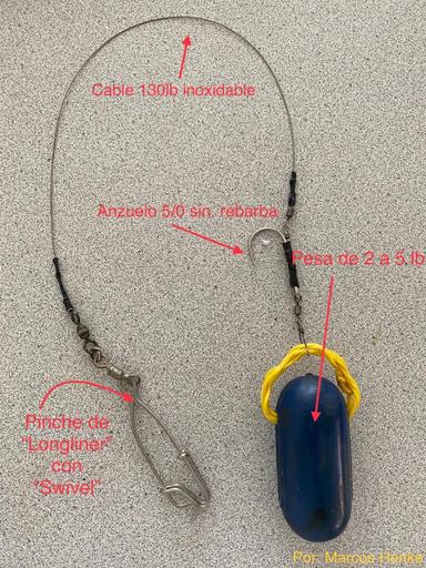 Left: Always have ready a fishing rod with the descending device Central: Marcos Hanke shows a descending device made with two 8oz weights and a barbless J-hook Right: Homemade descending device built by Marcos Hanke