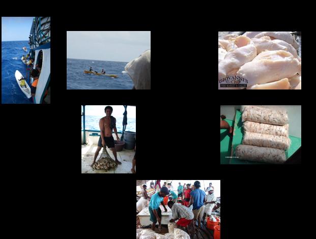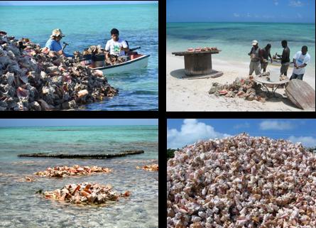 En otros casos, las pesquerías son artesanales en que el producto se desembarca con muy diversos niveles de limpiado de la carne y en numerosos lugares dependiendo del destino de los mismos, especialmente si son para consumo local. Los pescadores artesanales que operan pequeñas embarcaciones y que desconchan el caracol en lugares costeros que rara vez son autorizados (Figura 3) y desembarcando los productos en lugares de venta o acopio costeros existiendo adicionalmente un mercado de producto fresco inmediato (por ejemplo en puestos de expendio de ensaladas de caracol o para consumo privado) para lo cual los caracoles se mantienen vivos en cautiverio hasta el momento de su consumo.