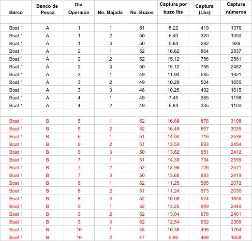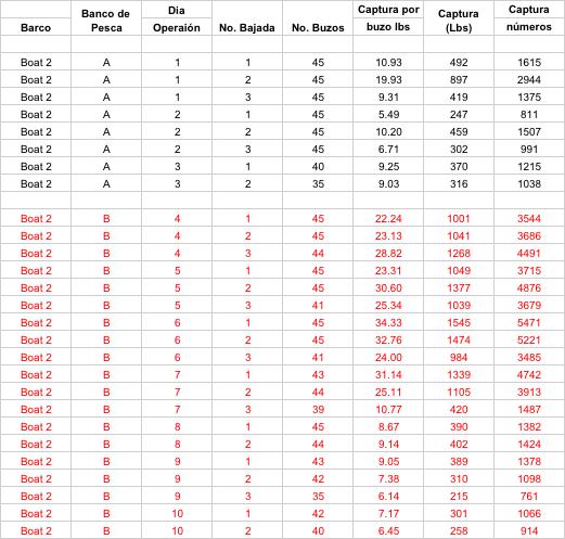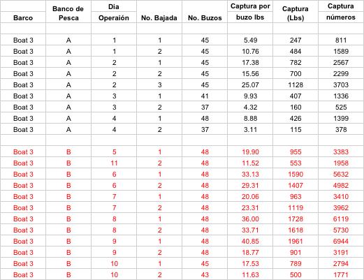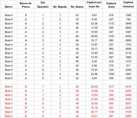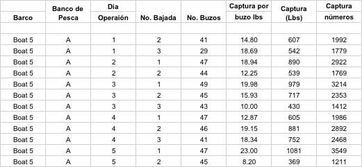 La información sobre los procesos y resultados de la pesca recabada desde las anotaciones de los capitanes y que debieron haber sido digitalizadas en las oficinas de pesca deberían tener un contenido y formato aproximadamente como el que se presenta en el Apéndice III, que representan datos reales obtenidos de la manera y formas descritas hasta aquí. Desde aquellos datos se aprecia que se realizaron operaciones de pesca significativamente diferentes en cuanto se refiere al esfuerzo de pesca. Se observa, por ejemplo, que el número de bajadas de buzos por día de pesca (cada línea en el Apéndice III) varió entre los barcos y dentro de cada barco (esto es, dos a tres salidas diarias) mientras que el número efectivo de días totales de pesca fue muy similar en los barcos que operaron en los dos bancos y que fue de 10 días para los barcos 1, 2 y 3, y de 9 días para el barco 4. En el caso del barco 5 operó 8 días en un solo banco de pesca. Dichos tiempos estarían definidos en gran parte por la capacidad de buceo de la tripulación de pescadores, el avituallamiento para mantener tripulaciones tan numerosas, y la carga acumulada del producto de la pesca que justifica económicamente cada uno de los viajes de pesca.