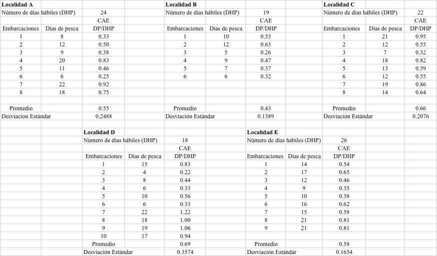 Por otra parte, los datos del censo deben proveer una primera visión sobre la operatividad de las flotas artesanales, las cuales pueden diferir como función de las localidades y su posición geográfica relativo a las distancias a los bancos de pesca y las condiciones del mar que pudieran afectar de forma diferencial a las operaciones diarias de pesca de cada lugar. Por lo tanto, estas características operacionales se ven reflejadas en los valores de días operables que afectan directamente los valores de CAE y el valor promedio del mismo. Los valores promedio de CAE estimados para cada localidad consisten en 0,55 y 0,69 para las Localidades A y D, mientras que para la Localidad E se pudiera tener un CAE promedio de 0,58 (Tabla 4).