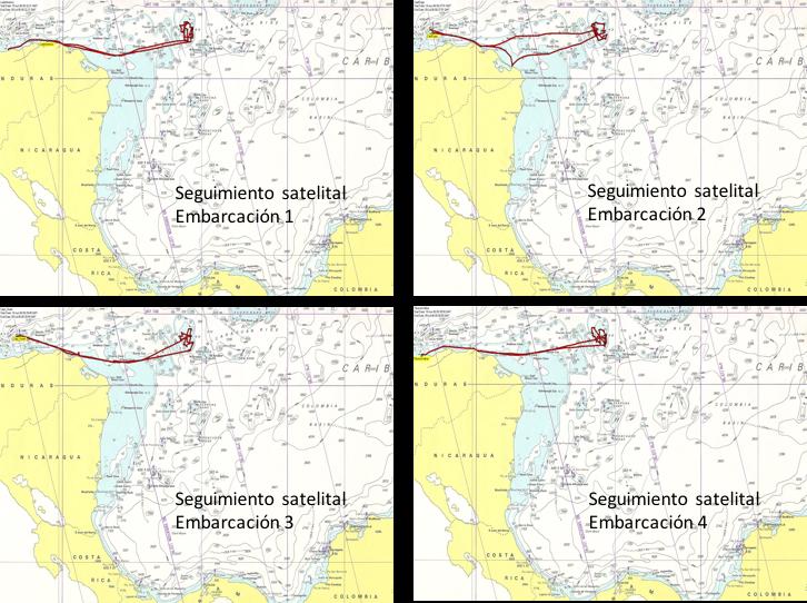 embarcaciones (esto es los derroteros) obtenidas desde los mapas del seguimiento satelital de todas las embarcaciones que se analizan para la definición de las características del origen de los desembarques. Se observa también que los cuatro barcos restantes operaron en ambos bancos de pesca A y B durante el mismo viaje y mes. Como consecuencia de lo anterior, los cálculos de desembarques expandidos a carne sucia y peso vivo deberán utilizar las ecuaciones dadas anteriormente como Ecuaciones 2 Para desembarques por viaje de pesca con separación de bancos de pesca: