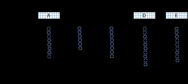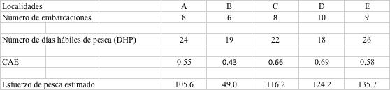 El ejemplo que se desarrolla en esta sección utiliza el diagrama de la figura 6 que correspondería a un área o región en que se supone se detectaron, desde un censo de las pesquerías de CR, que existían cinco localidades A, B, C, D, y E en donde se desembarcaba CR. Siguiendo los protocolos de levantamiento de información estadística presentado en la Sección 6.2 del Componente 1 de este Modulo de entrenamiento, como parte integral del censo se debieron enumerar todas las embarcaciones que habían estado realizando pesca de CR en cada una de las localidades. De este censo se obtuvo como resultado que en la Localidad A existían 8 embarcaciones, 6 en la B, 8 en la C, 10 en la D y 9 en la E (Figura 6 y Tabla 4). Adicionalmente, se solicitó a cada pescador entrevistado información sobre el promedio mensual de días de pesca que aproximadamente cada embarcación pudo haber realizado. Se solicitó también información sobre el número promedio de días al mes que probablemente se pierden debido a mal tiempo y/o condiciones de mar que impiden llevar a cabo operaciones de pesca y si es que se opera los días de semana y festivos. Con la información aportada se promedió para cada localidad el número de días no operables por condiciones fuera de control de los pescadores y se le agregó los días que en el mes corresponden a feriados o fines de semanas no operables que fue considerada como 4 días por mes y con ello se estimó el número de días hábiles u operables de pesca (DHP) por mes suponiendo que cada mes es de 30 días Se incluyen en la Tabla 4 los valores de Coeficiente de Actividades por Embarcación (CAE) las cuales fueron estimados como el cociente entre el número de días de pesca operados por mes y el número de días operables que efectivamente existían en promedio en los meses reportados por los pescadores. Toda esta información se encuentra tabulada en la Tabla 4 para cada una de las 5 localidades.