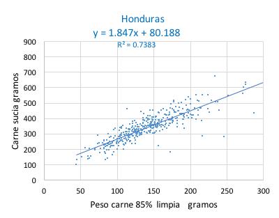 Figura 13. Regresión lineal del peso carne sucia como función del peso de la carne 85% limpia para CR en Honduras (Datos desde Ehrhardt y Pérez 2019)
