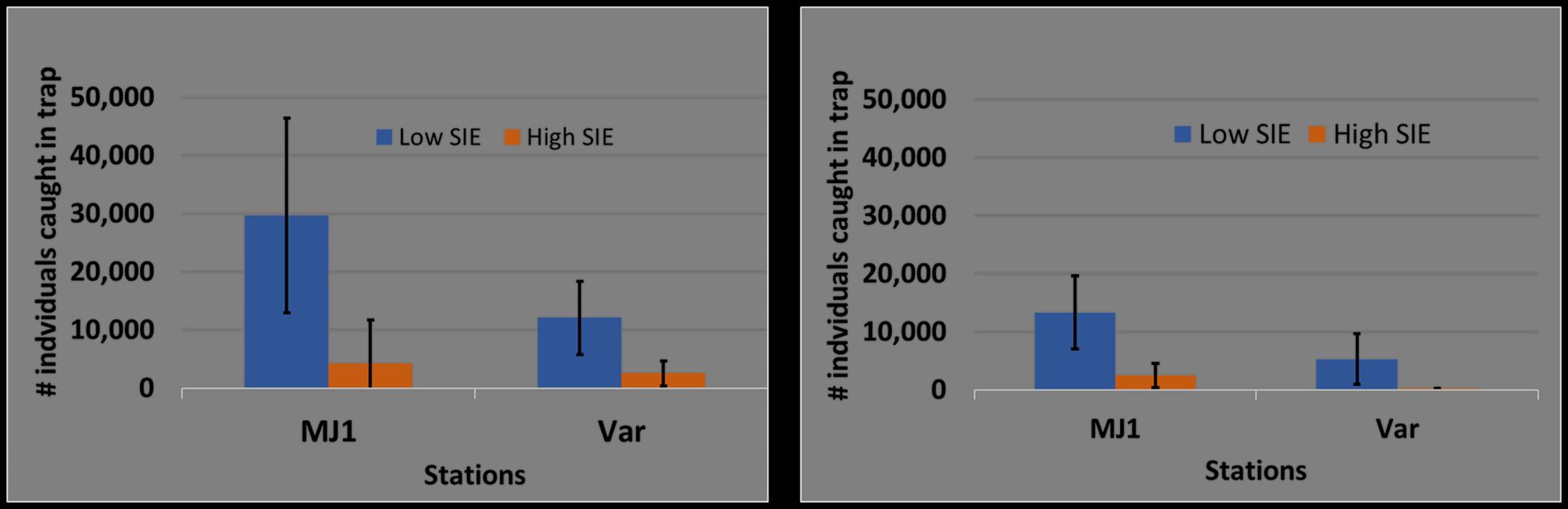 Holoplankton (A) and Meroplankton (B) captured using light traps under low and high Sargassum inundation events (SIE) during 2022 at MJ1, La Parguera, Puerto Rico.