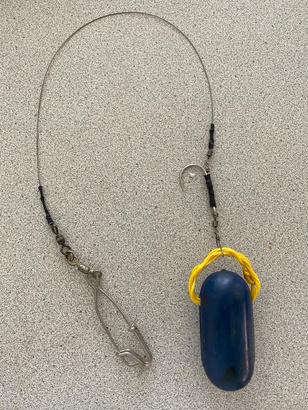 Izquierda: Ten siempre una vara o carrete ya preparados con el dispositivo de liberación Central: Marcos Hanke muestra un dispositivo de liberación hecho con dos pesas de 8 oz y un anzuelo tipo J sin rebarba Derecha: Dispositivo de liberación preparado en casa por Marcos Hanke