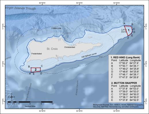 Económica Exclusiva (ZEE) del Caribe estadounidense, que se extiende 3 millas náuticas desde la costa de las Islas Vírgenes Estadounidenses (USVI) hasta el límite mar afuera de la ZEE, y 9 millas náuticas desde la costa de Puerto Rico hasta el límite mar afuera de la ZEE
