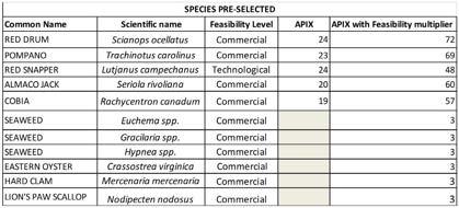 Table 2: Table of results for species pre-selected for offshore aquaculture development.
