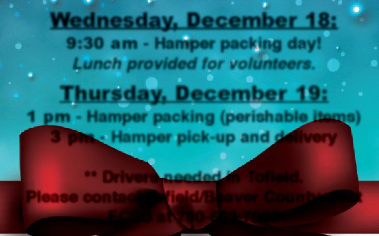Thursday, December 19: 1 pm - Hamper packing (perishable items) 3 pm - Hamper pick-up and delivery ** Drivers needed in Tofield. Please contact Tofield/Beaver County west FCSS at 780-662-7067