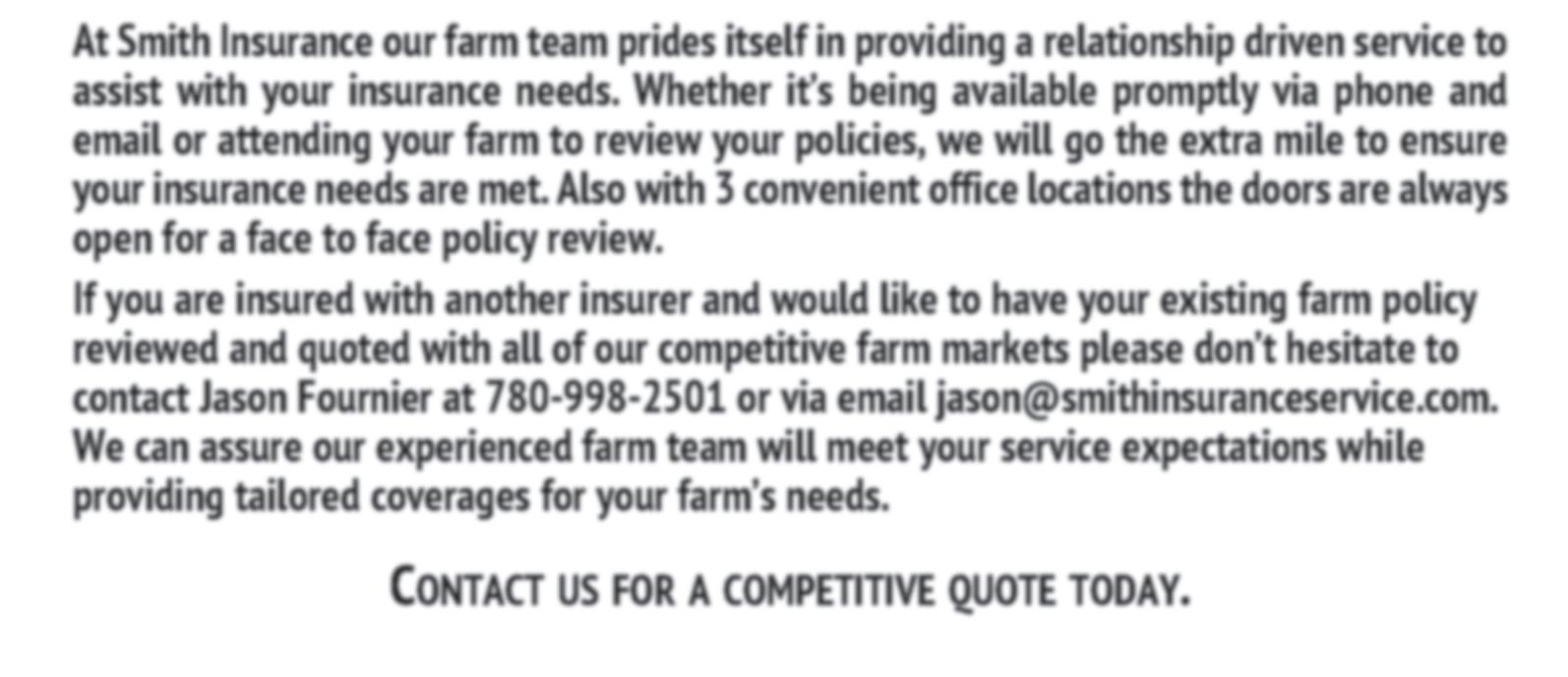 If you are insured with another insurer and would like to have your existing farm policy reviewed and quoted with all of our competitive farm markets please don’t hesitate to contact Jason Fournier at 780-998-2501 or via email jason@smithinsuranceservice.com. We can assure our experienced farm team will meet your service expectations while providing tailored coverages for your farm’s needs.