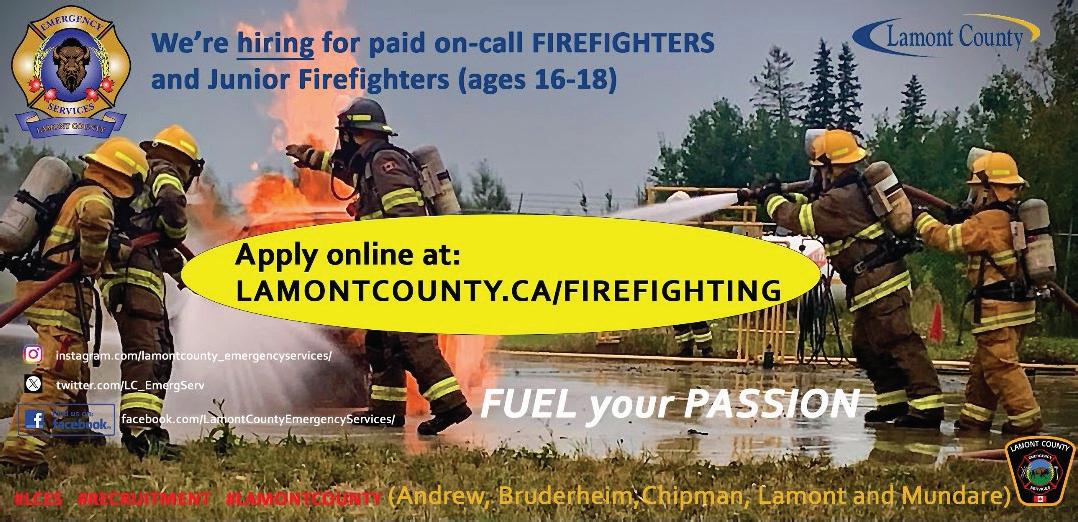 Lamont County has fire departments in Bruderheim, Lamont, Chipman, Andrew and Mundare.