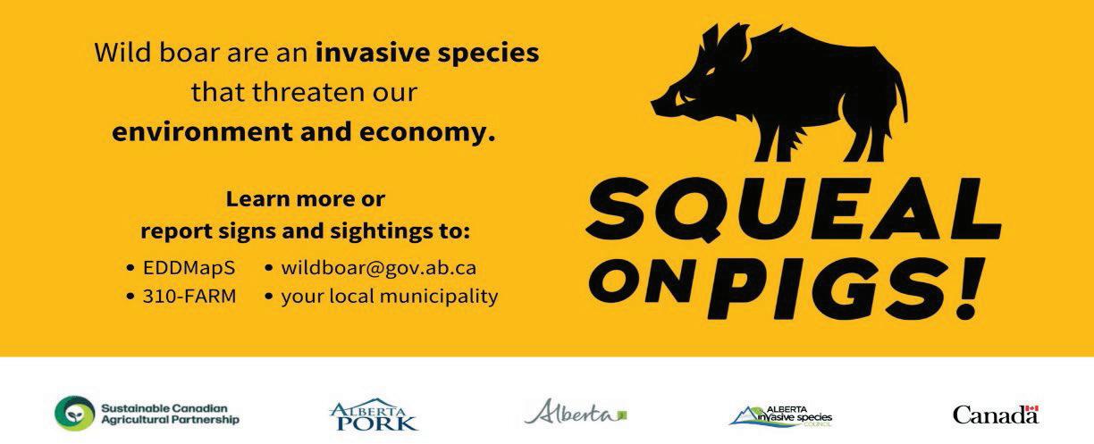 As part of the Squeal on Pigs/Wild Boar control, Lamont County has installed cameras at specific locations to monitor boar traffic (including on or near private land) in the efforts to control and eradicate. This is an eight-month surveillance program developed in conjunction with Alberta Pork and Squeal on Pigs. Learn more about how wild boar is controlled in Alberta at: alberta.ca/wild-boar-inalberta.aspx. This invasive pest cannot be controlled by hunting. Report a sighting or if you have questions, contact Lamont County Agricultural Services at 780-8952585 or abinvasives.ca/squeal-on-pigs, 310-FARM (3276) and wildboar@gov.ab.ca