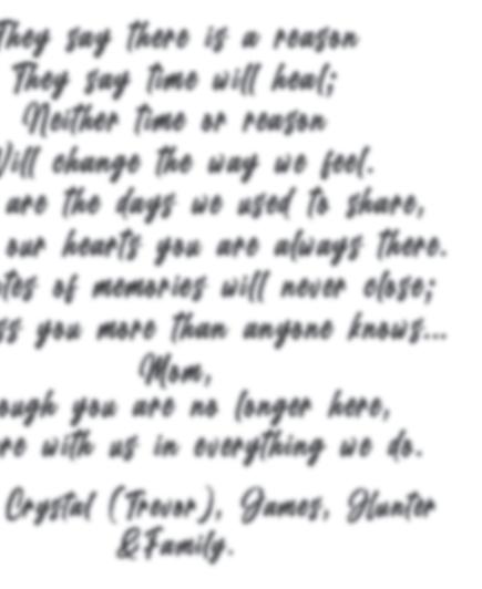 They say there is a reason They say time will heal; Neither time or reason Will change the way we feel. Gone are the days we used to share, But in our hearts you are always there. The gates of memories will never close; We miss you more than anyone knows... Mom, though you are no longer here, you are with us in everything we do. Dean, Crystal (Trevor), James, Hunter &Family.