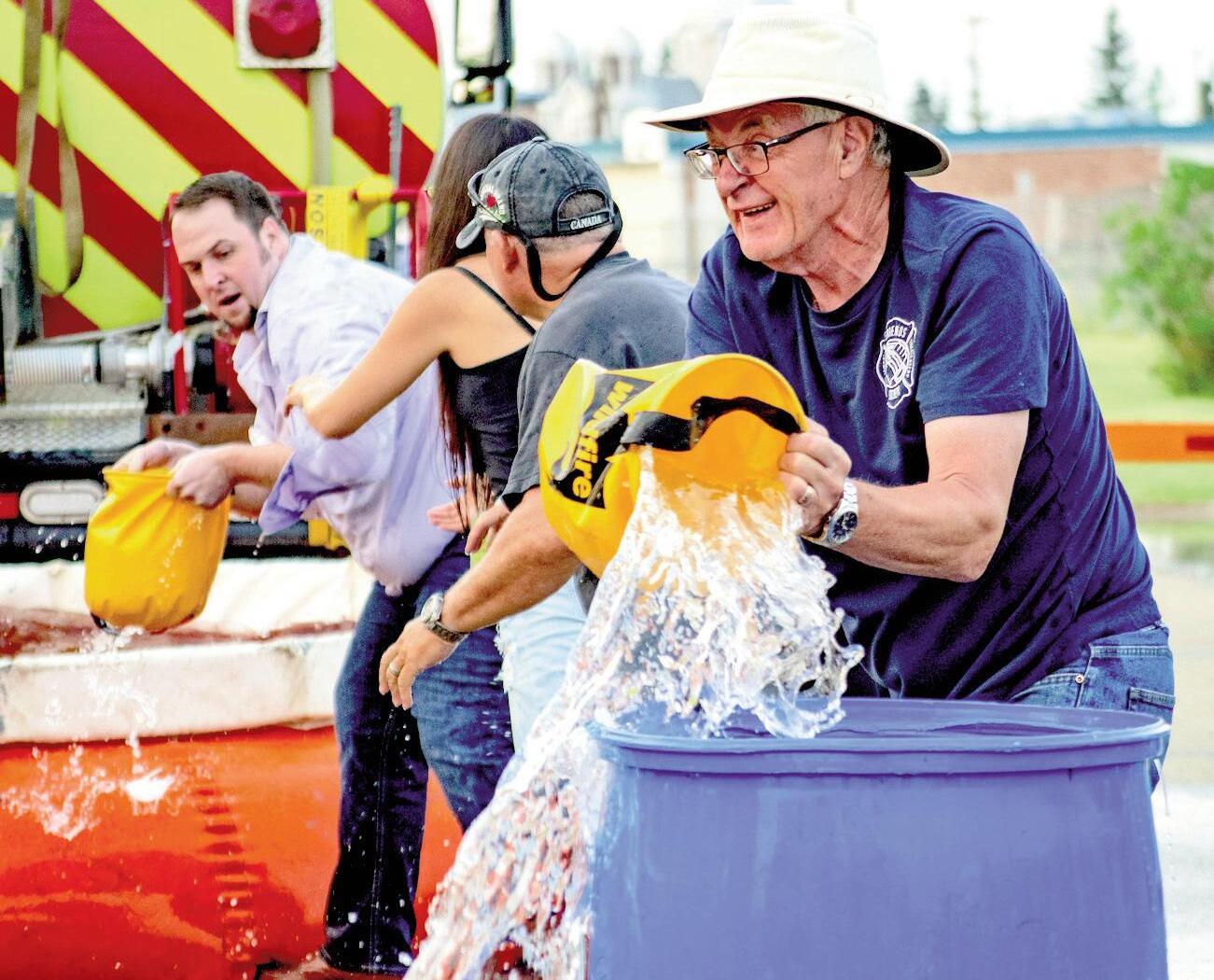 Retired Lamont Deputy Fire Chief Herman Sieker checks out the competition as he works to fill his team's barrel during the Bucket Brigade competition at the Lamont Summerfest barbeque on July 7. Also shown in the background, are team members Lamont Mayor Kirk Perrin handing a full bucket off to administrative assistant Jaclyn Ponto, with Mike Mullany (husband of councillor and school trustee Colleen Holwaychuk) waiting to pass the bucket. Photo: Jana Semenuik