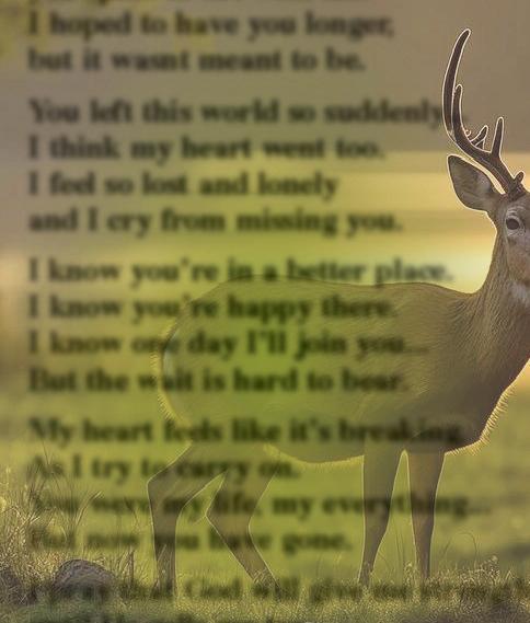I know you’re in a better place. I know you’re happy there. I know one day I’ll join you... But the wait is hard to bear. My heart feels like it’s breaking, As I try to carry on. You were my life, my everything... But now you have gone. I pray that God will give me strength, until He calls me too.