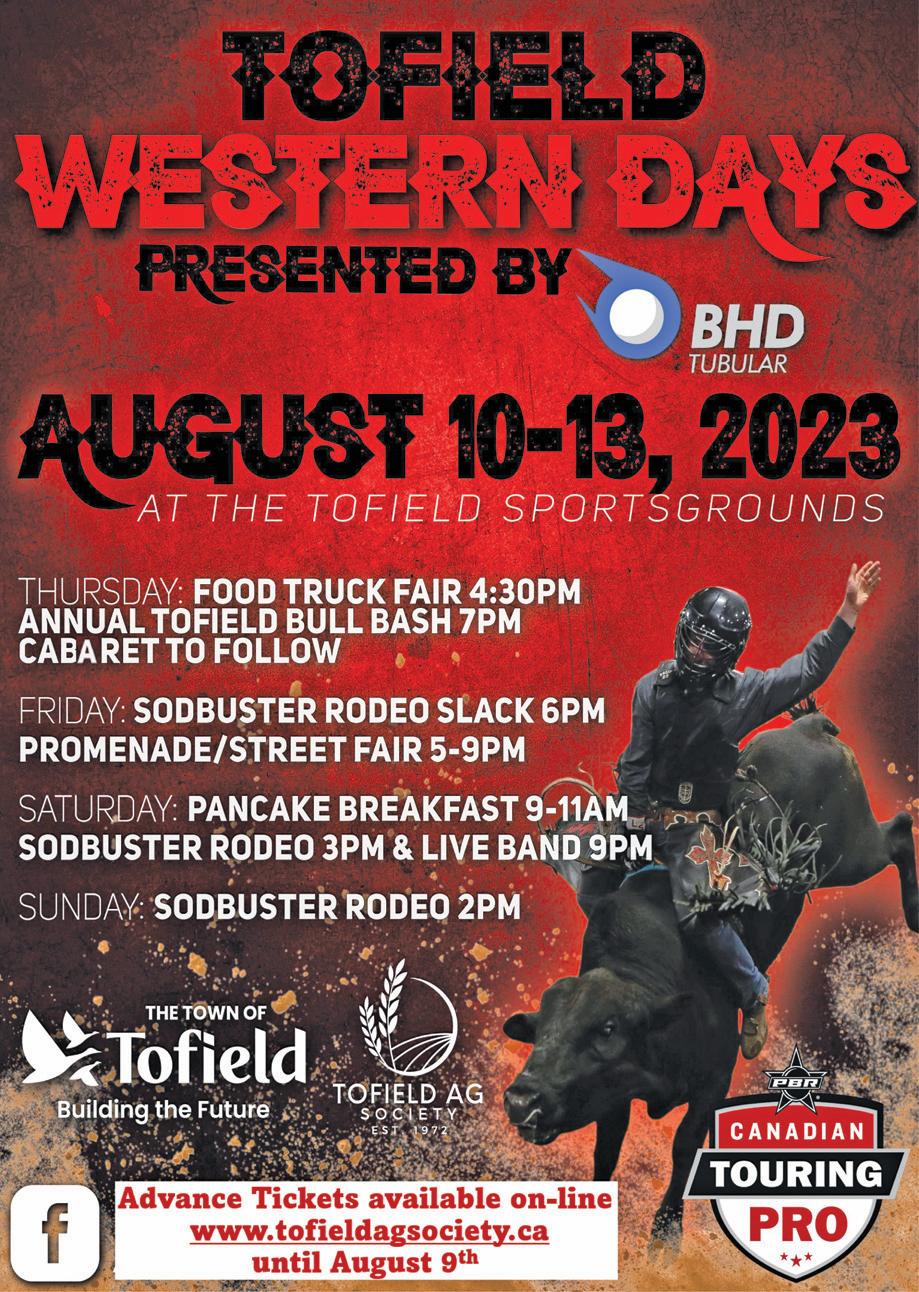 The Lamont Leader (Lamont, Alberta), Wednesday, July 26, 2023 - 3 1914 - 2023 • ABRA JACKPOT - 7 PM CONTACT FOR INFO: 780-688-3735 WWW.BRUCESTAMPEDE.CA FREE PARKING • FREE CAMPING FOLLOW US ON TWITTER FIND US ON FACEBOOK SATURDAY, JULY 29 • LOCAL RODEO 12:30 pm $10: 12 yrs & older • PRO RODEO SLACK 6PM HORSESHOE TOURNAMENT 1PM. Call Lane 587-280-5620 to enter. • PANCAKE BREAKFAST 8 - 10AM at Rodeo Grounds & Community Hall • CHRISTIAN COWBOYS GOSPEL SERVICE 11AM - 1PM Rodeo Grounds • PARADE 10 am Judging at 9 am. Prizes for Best Entries. To enter call Shirley 780-632-1042 • HORSESHOE TOURNAMENT 1PM. Call Lane 587-280-5620 to enter. • BEER GARDENS • PRO RODEO EVENTS Starting at 1 Chute Gate Sponsors Viking Auction Market Wainalta Motors Ltd. Beaver County Tofield Packers Battle River Implements D & D Septic Service Webbs Vegreville Family Dental Kittle Seed Farm Westar Drilling Nutrien Ag Solutions Hogstead Welding Infield Sponsors 840 CFCW Ward TireCraft Field Harvesting & Transport Bruce Shell Cargill Flaman Rentals Labreche Plumbing Flo Form Counter Tops Deerland NS Welding Alberta Ram Truck Dealers Alberta Donkey and Mule Club LMG Mechanical Section One Angus Quilts and Stuff Losness Drilling Rocky Mountain Equipment Cross Country Sales Prairie Rose Vet Hurum Trucking 6B Welding and Fab Larry Brown Home Time Realty Spur Petroleum Hairy Hill Cattle Company Perogy Trucking Grizzly Oilfield Services Claystone Waste Ltd InAct Surveillance Travel Alberta Government of Alberta Alberta Foundation of Arts BS Cattle Company Bonham Earthworks Pine Cliff Energy Cro-West Dirt Works Ltd. Crop Management Solutions UFA Trophy Sponsors Saddle Bronc: Hank & Vicky Field Memorial Bareback Bronc: Paul Chrystian Memorial Steer Wrestling: Bruce Hotel Tie Down Roping: Bill & Murray Dorin Memorial Trophy Wild Horse Race: Bruce Ag Society Rose Mae Kjelland/Viking Funeral Services Ernie Dorin Memorial Ladies Barrel Racing: LMG Mechanical Steer Riding: Chomik Bros. Team Roping: Bonness Supply Bull Riding: Vern Ozubko Memorial Platinum Sponsors Wild Rose Cooperative Association Ltd. OK Tire Tofield NuEarth Soil Solutions Raven Hill Insurance Beaver County Gold Sponsors Flo Form Countertops Silver Sponsors Suchy Brothers LMG Mechanical CPRA/PRCA Approved Stock: Northcott & Yuke Rodeo Announcers: Tyson Pietsch & Dustin Edwards Clown: Ricky Ticky Wanchuck ABRA 7 PM FRIDAY, JULY 28 7806321042 • PRORODEO SUNDAY, JULY 30 • MULE RACES • BEER GARDENS • DANCE 9 pm at the Stampede Grounds 18 years & older only. Music by: Up All Night - $10