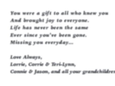 You were a gift to all who knew you And brought joy to everyone. Life has never been the same Ever since you’ve been gone. Missing you everyday… Love Always, Lorrie, Corrie & Teri-Lynn, Connie & Jason, and all your grandchildren