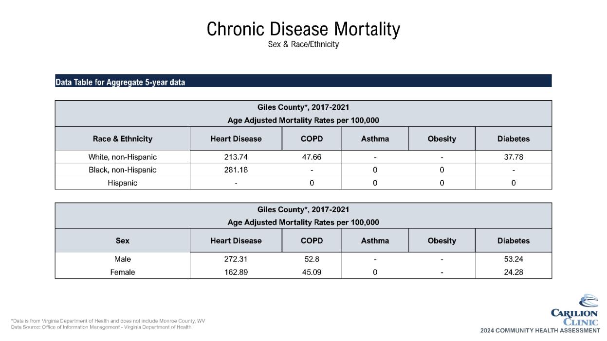 • Chronic disease hospitalizations for hypertension and diabetes are much higher in Giles County than Virginia.