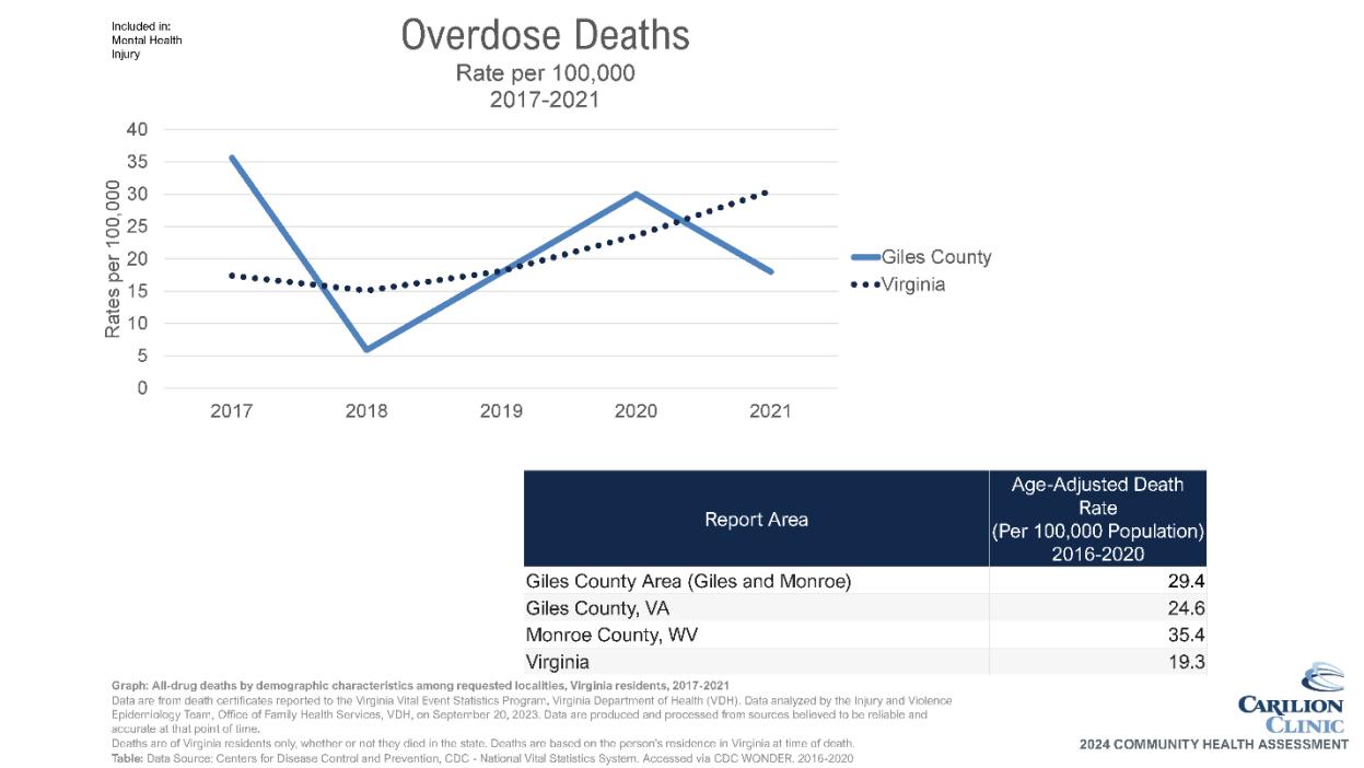 • Giles County overdose death rates are more variable than state average, likely due to small population size. Decreased from 2020-2021.