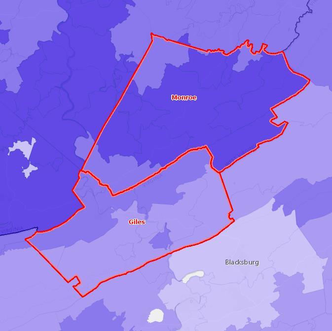 Both counties have similar demographics, although Monroe County is less densely populated. Both localities vary from state and national demographics showing less racial diversity, lower median income and higher median age. The Weldon Cooper Center for Public Service predicts a -1.1% population change by 2040 for Giles County 1 Although county-level data is not available for Monroe, the center predicts a statewide population decrease for West Virginia of 7.8%.2