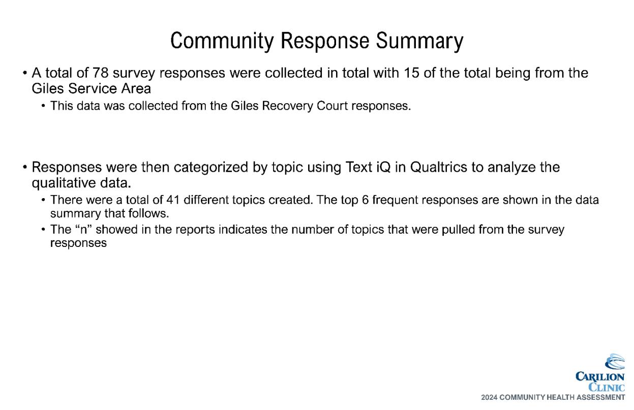 Carilion, Giles County FOCUS (Focus on Communities Utilizing Services) and the New River Health District collaborated to conduct the 2024 GCACHA alongside additional community partners, the Community Health Assessment Team (CHAT) After review and discussion of the data collected, the 2024 GACHA led the CHAT to identify seven priority health issues in the community.