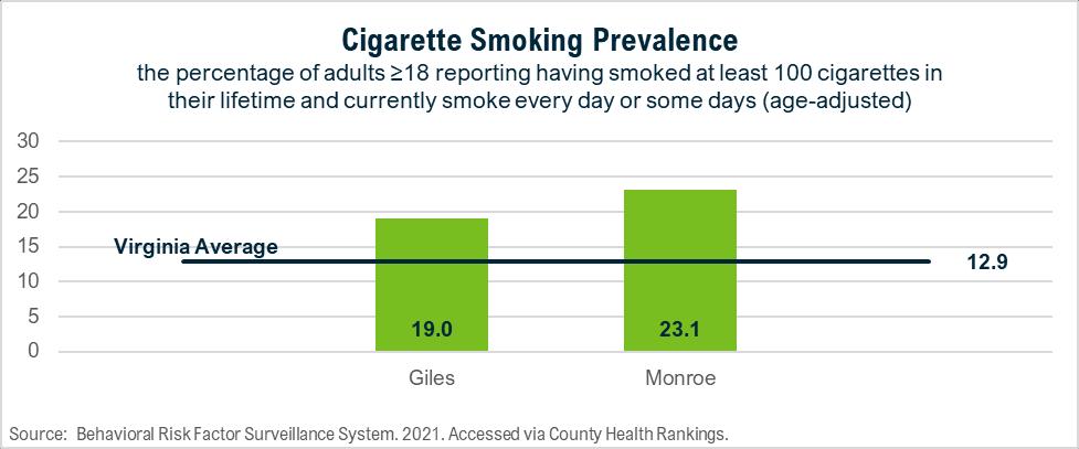 • New lung cancer diagnosis is higher in Giles County than Monroe and Virginia