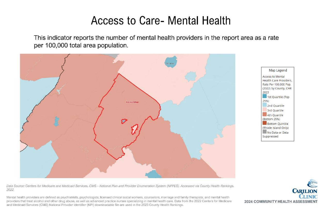 Carilion, Live Healthy Rockbridge (LHR) and the Central Shenandoah Health District (CSHD) collaborated to conduct the 2024 RACHA alongside additional community partners, all of whom comprise the Community Health Assessment Team (CHAT). After review and discussion of the data collected, the 2024 RACHA led the CHAT to identify seven priority health issues in the community.