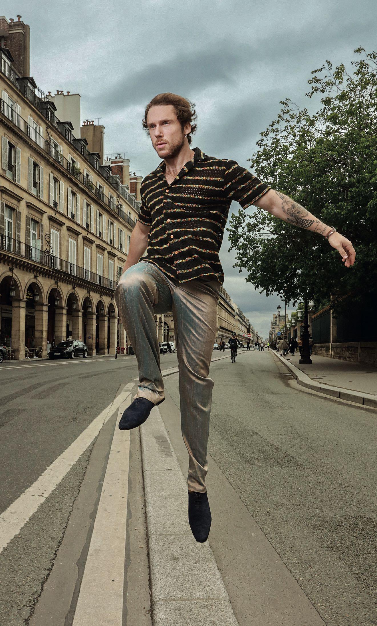 La producción realizada con Cosas en París no fue solo una sesión editorial, sino una prolongación visual del universo Kielle. Esta vez, el lente de Julio Gonzales capturó la colección en escenarios íntimos pero cargados de simbolismo parisino: plazas custodiadas por leones de piedra, rooftops industriales, fuentes mitológicas. “Queríamos alejarnos de la postal típica. Elegimos locaciones que los parisinos reconocen como suyas, no necesariamente las que buscan los turistas. Y trabajamos con personas que también están contando sus propias historias: músicos, actores, creadores”, explica el diseñador.