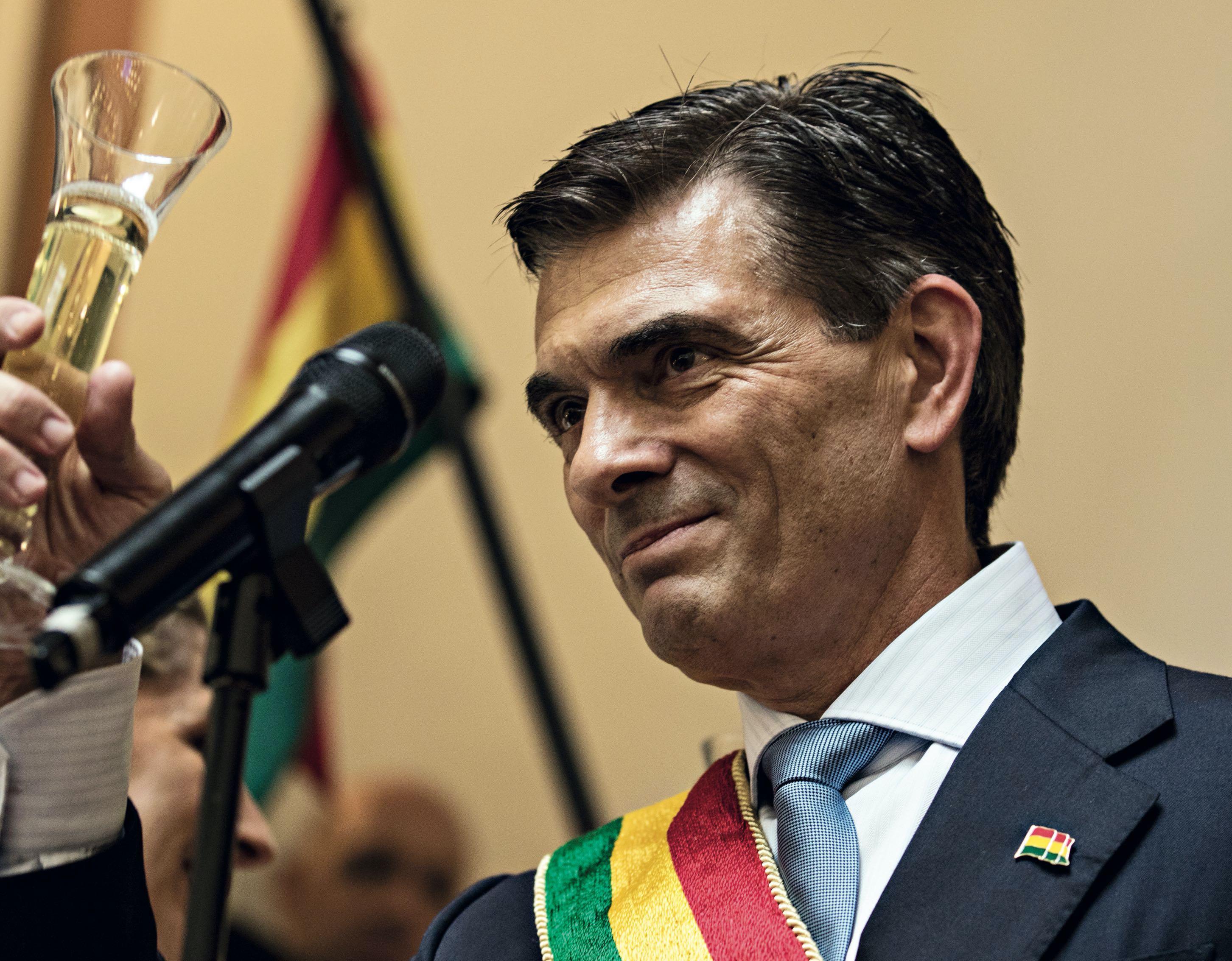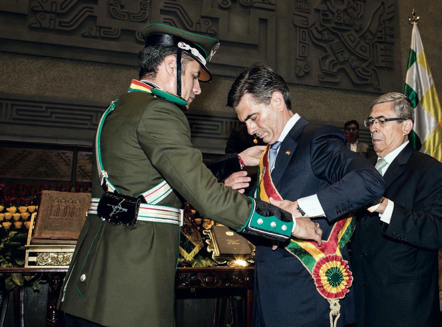 En este oscuro y frío garaje, Paz Pereira se despidió de su familia y amigos con fuertes y emocionantes abrazos, para luego dirigirse al salón del gabinete en el Palacio Quemado. Aquí fue donde tomó los últimos apuntes de su discurso y practicó el mismo en un ambiente íntimo, acompañado solo por un par de sus más cercanos colaboradores. Un par de pantallas de televisión mostraban el inicio de los actos oficiales, algo retrasados por la fuerte lluvia que caía en el kilómetro cero del país. Imágenes de la llegada de los dignatarios de Argentina, Chile, Ecuador, Paraguay y Uruguay, que acompañaron a Paz Pereira en tan importante día junto a más de 70 otras delegaciones, mostraban la importancia de la nueva etapa que comenzaba a vivir el país.