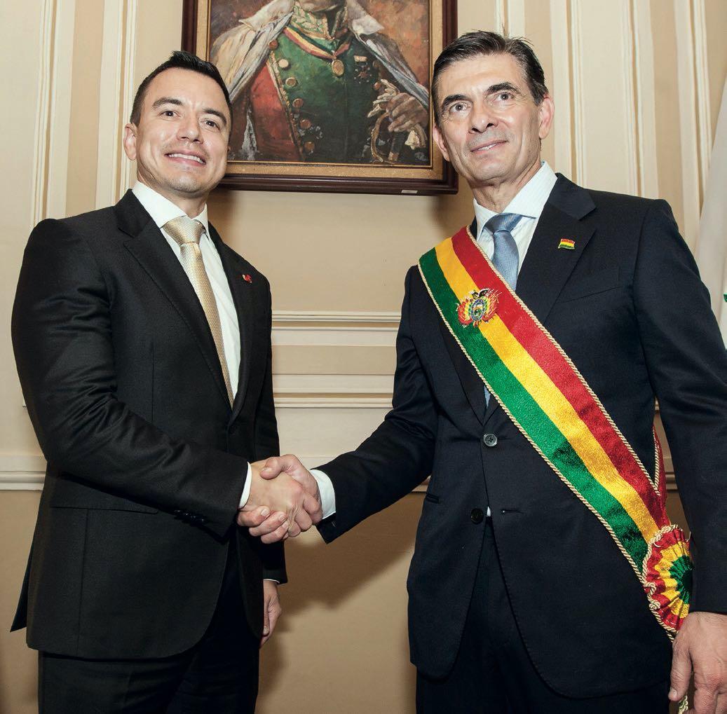 Minutos después, y en el mismo edificio, el flamante presidente saludaría al presidente de Chile, Gabriel Boric, con quien sostuvo una corta charla y un intercambio de regalos, para luego pasar a un salón VIP para su primera reunión bilateral con el presidente de Argentina, Javier Milei. En este encuentro, el presidente de Argentina, acompañado de su hermana, ofreció al presidente Paz sus felicitaciones y apoyo en este gran desafío, recordando que ambos países son hermanos. Minutos después, y antes de salir a la plaza Murillo, el presidente y vicepresidente, junto a sus familias, compartieron un momento en un salón del antiguo Congreso.