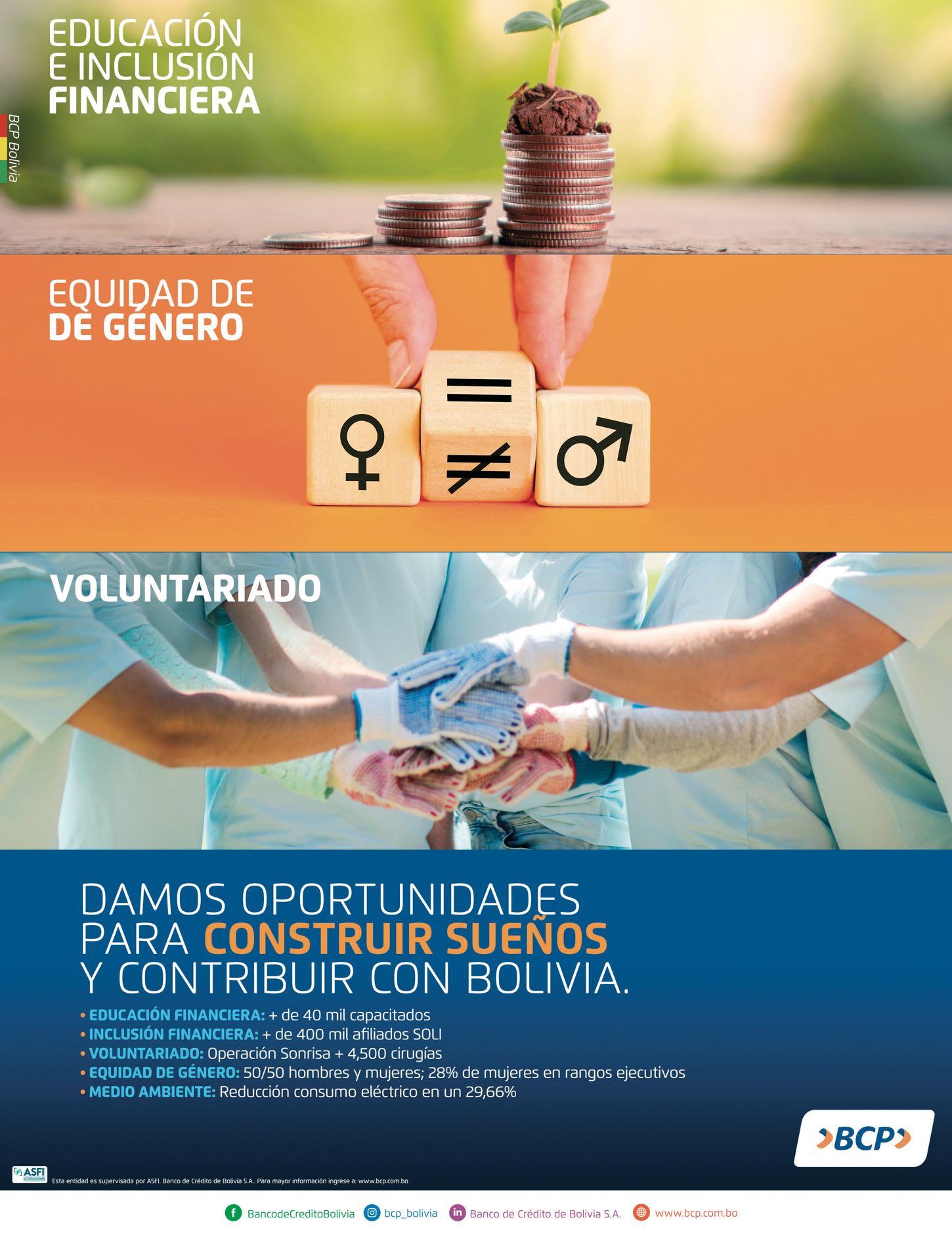 Todas estas acciones permiten al BCP acercarse a cumplir su propósito: ser un aliado responsable para dar oportunidades para los bolivianos y transformarse aceleradamente en una empresa tecnológica que ofrece los mejores servicios financieros. n