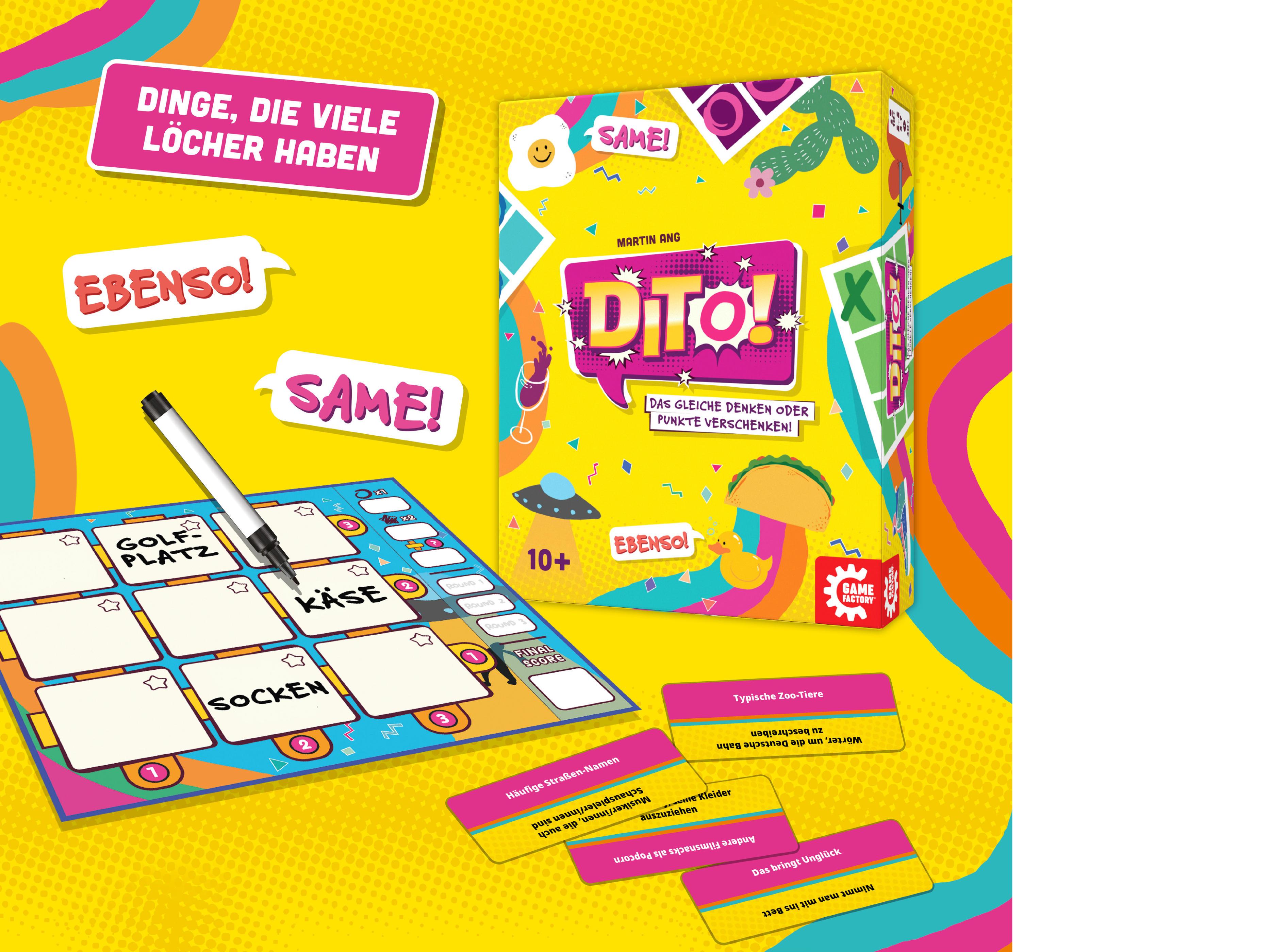 „Dinge, die in Paaren kommen“, „Typisch Deutschland“ und „Filme, die einen zum Weinen bringen“. Falsche Antworten gibt es in DITO! nicht – sehr wohl aber solche, die dir keine Punkte bringen, weil kein Mitspieler das Gleiche notiert hat. Wirst du also kreativ oder gehst du mit dem scheinbar Offensichtlichen? Synchronisiere deine Gedanken mit deinen Mitspielern, sammle wertvolle BFF–Sterne und sichere dir Bonuspunkte für Reihen und Spalten.