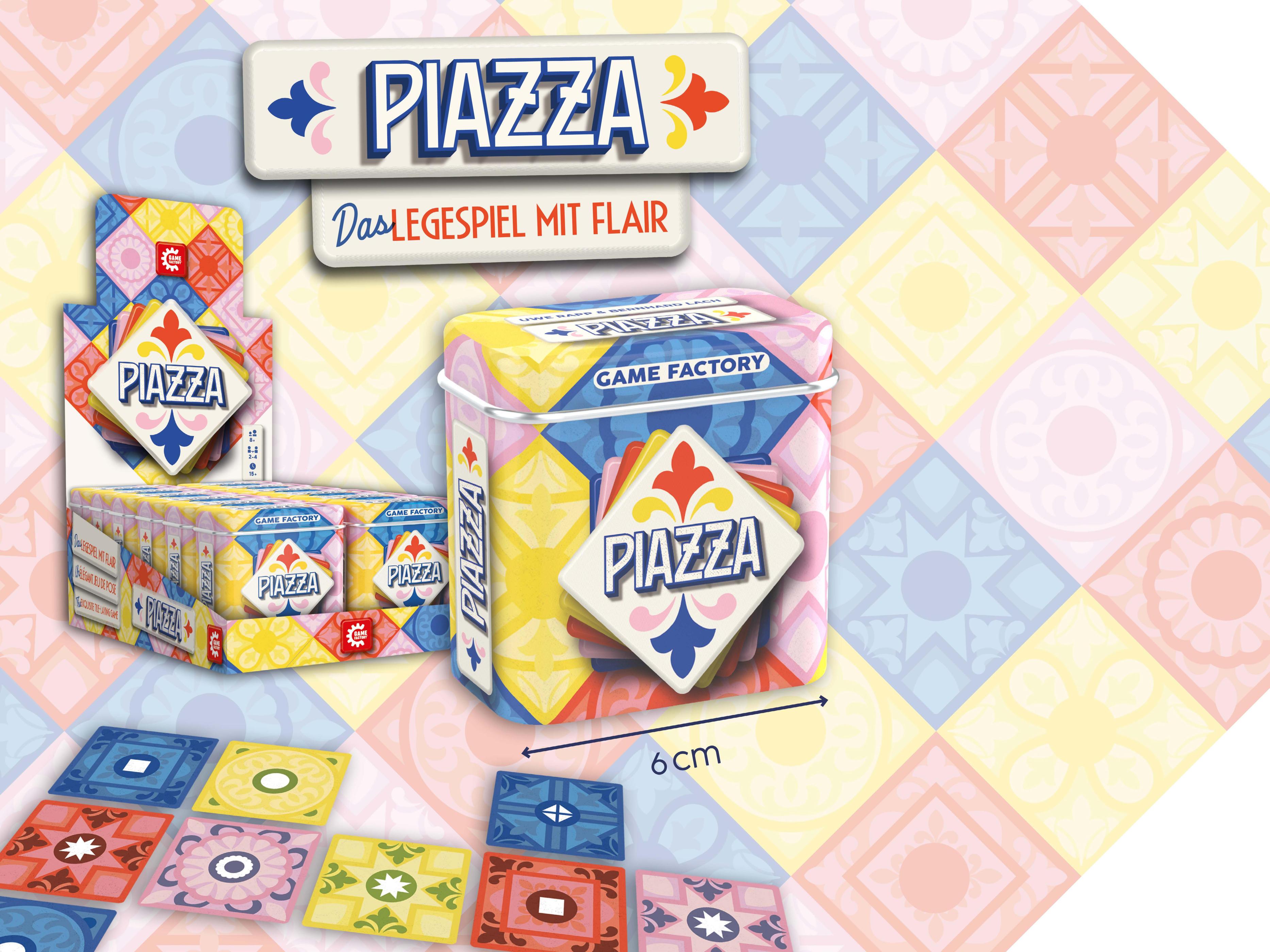 Das neue Spiel in der beliebten Minidose ist ein taktisches Legespiel. Zug für Zug versuchen die Spieler möglichst viele gegnerische Kärtchen einzuklammern, um so zu Punkten. Nach und Nach entsteht in der Tischmitte eine farbenfrohe Piazza. Diese sorgt nicht nur für eine beeindruckende Tischpräsenz, sondern bietet den Spielern mit Fortlauf der Partie auch immer mehr Möglichkeiten.