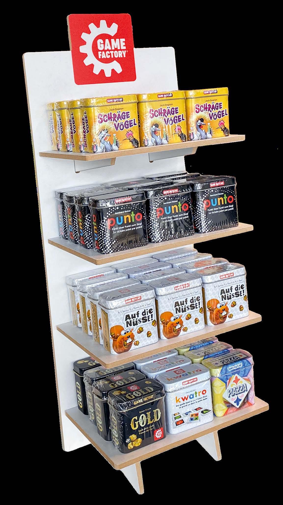 Dieses wertige Holzdisplay fasst 48 Dosenspiele. Bei der Bestellung der entsprechenden Menge haben Sie die Möglichkeit auf ein kostenloses Display. Dieses ermöglicht Ihnen eine aufmerksamkeitsstarke Präsentation der Topseller-Linie.