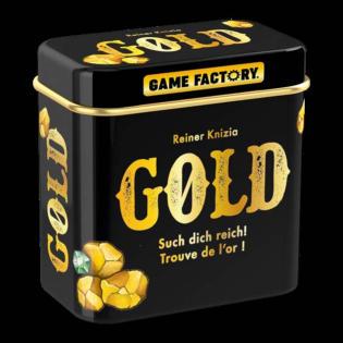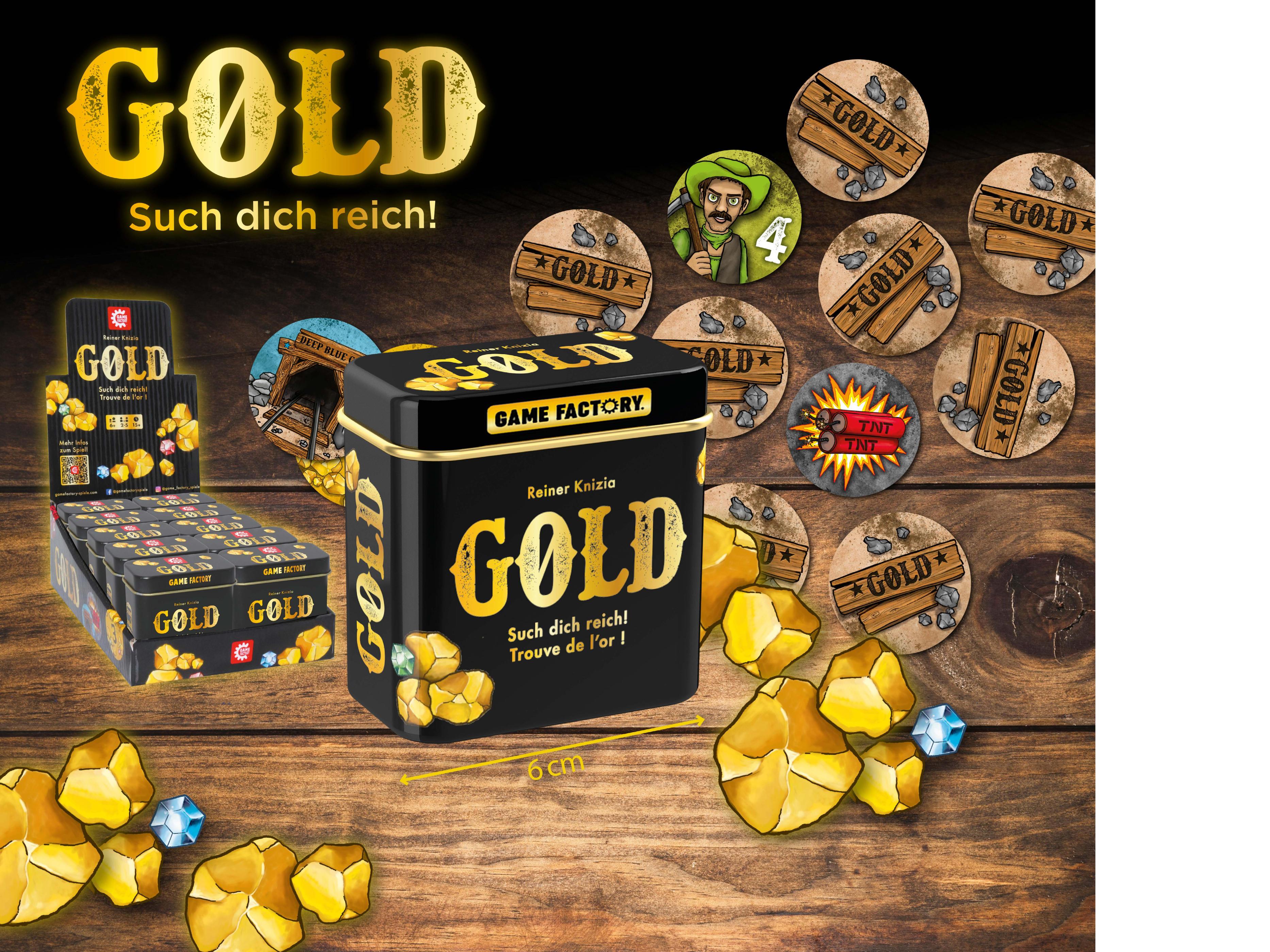 Bei diesem explosiven Memo-Spiel will jeder Spieler das meiste Gold schürfen. In seinem Zug deckt jeder Spieler zwei Karten auf. Dabei ist ein gutes Gedächtnis wortwörtlich Gold wert, denn wer die falschen Karten aufdeckt, schürft womöglich für seine Mitspieler, wird von stärkeren Goldgräbern aus der Mine vertrieben oder iegt, wenn er auf eine Dynamit-Karte stößt, gar in die Luft! GOLD ist großer Spiel-Spaß in der kleinen Dose!